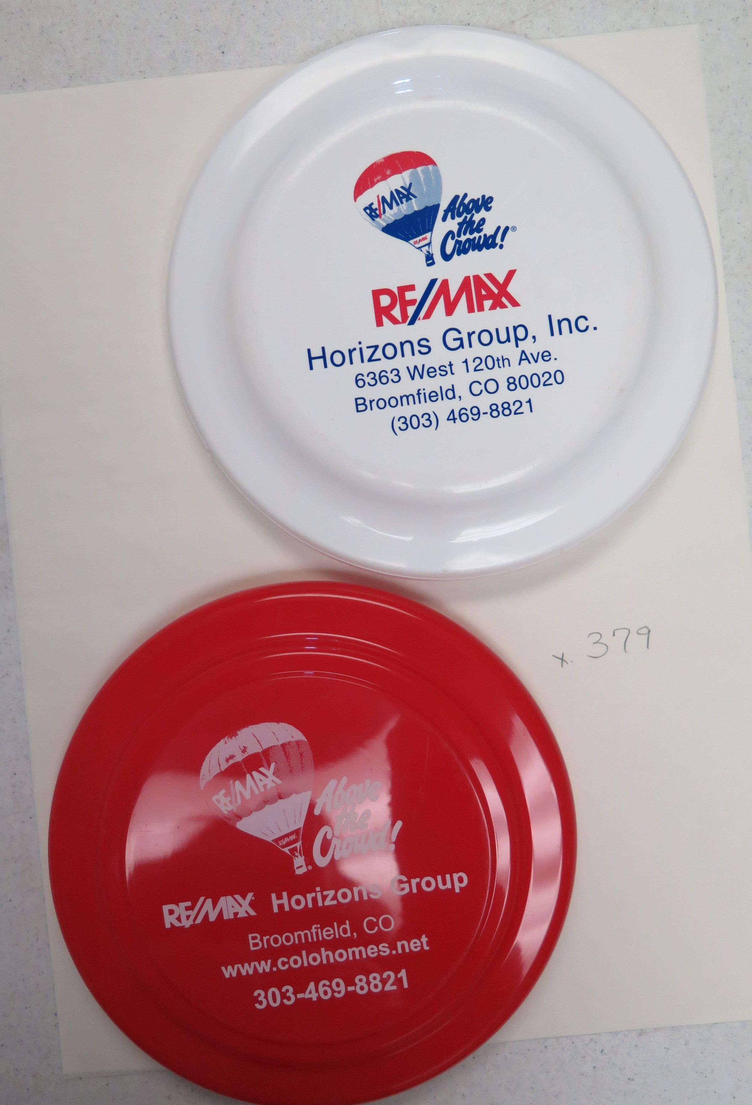 These are two plastic frisbees. 9"(Dia). The advertise the Broomfield ReMax office.