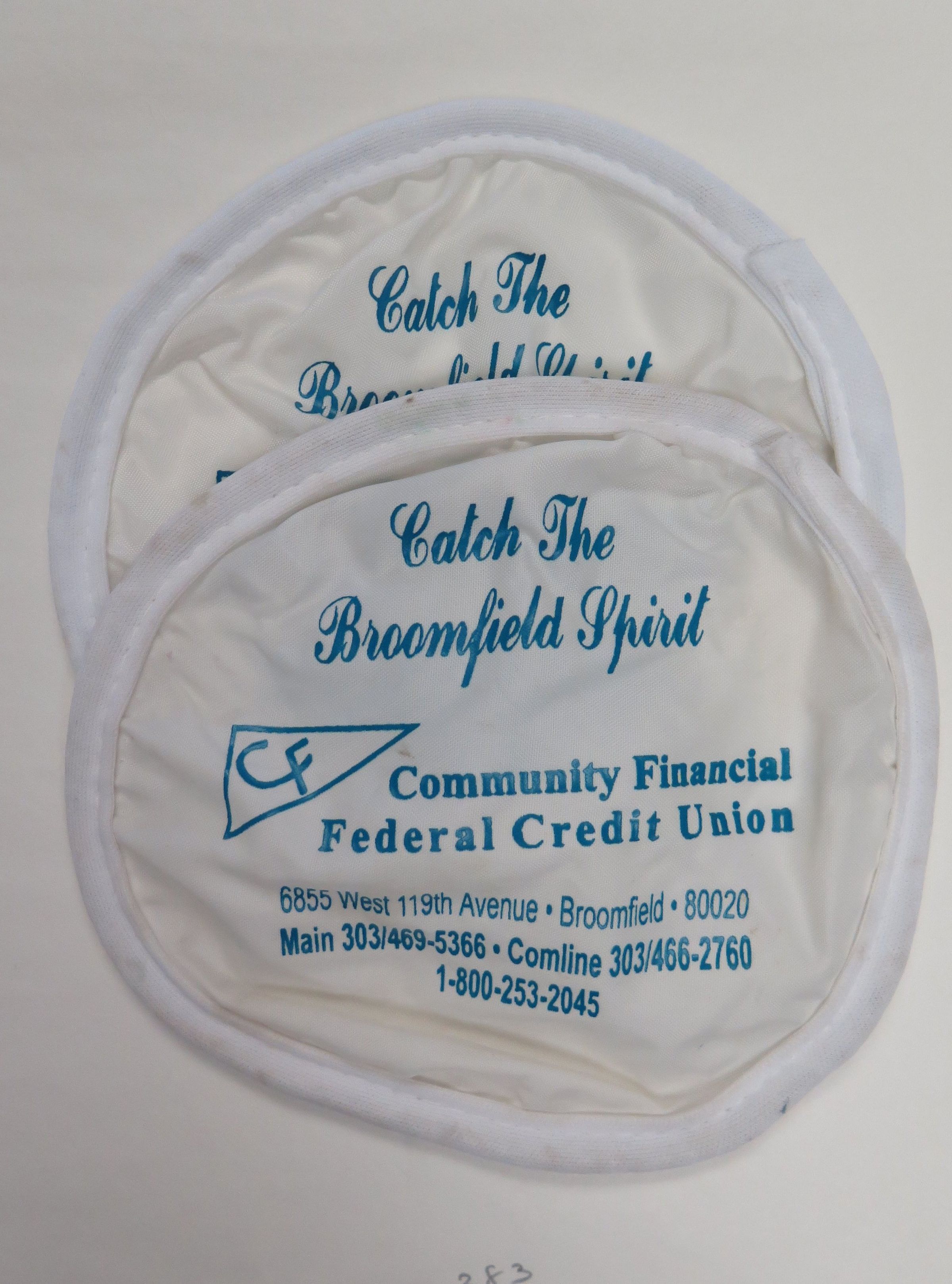 These are a pair of "soft" frisbees 7.5"(Dia). They advertise Community Financial Federal Credit Union.
