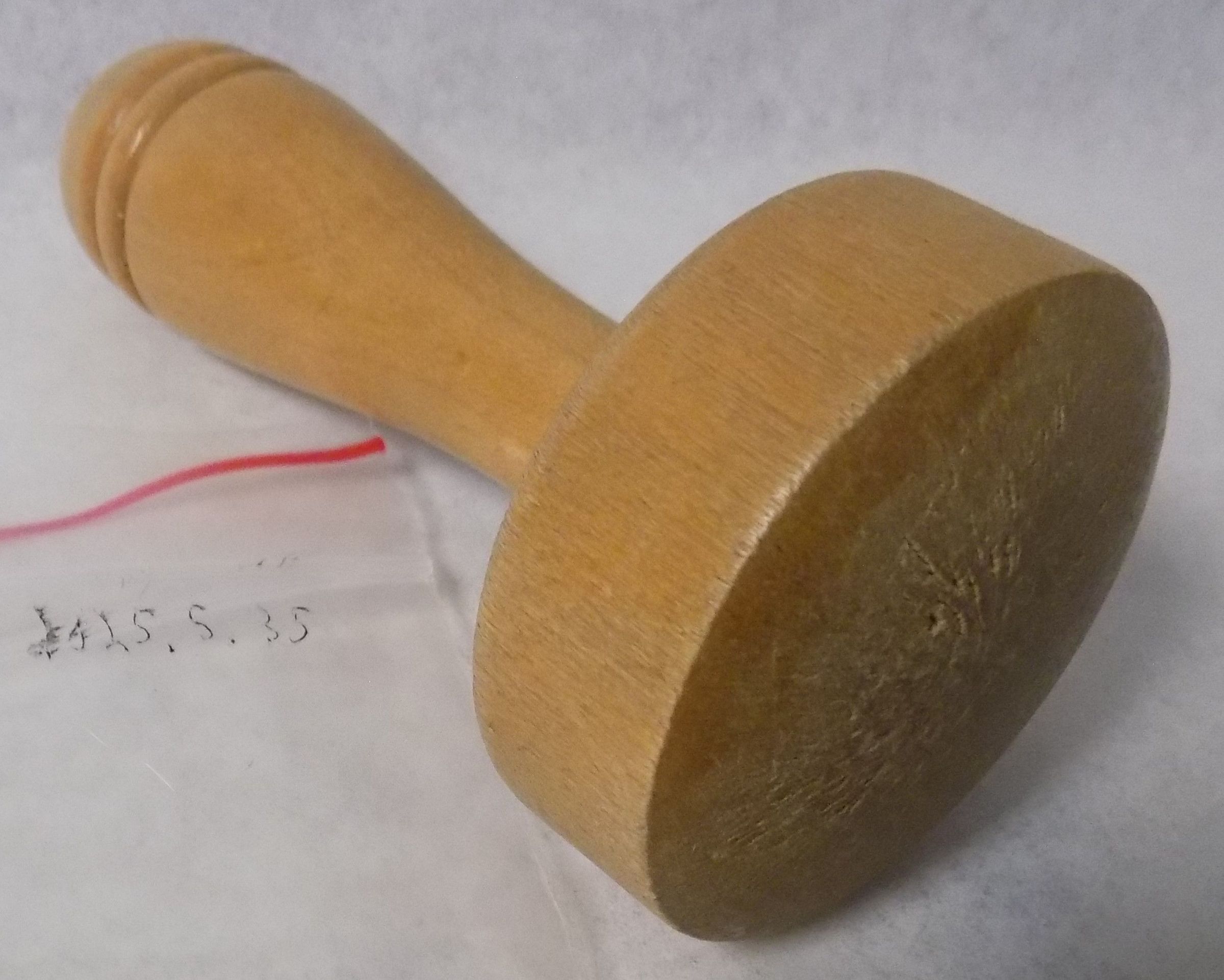 Item is a wooden sock darner shaped sort of like a mushroom, with a convex top. Sock darners were used to make the darning process easier. During darning, which involves fixing holes in knitted fabric, the sock darner would be placed inside the sock to stretch the fabric firm, making it much easier to mend tears and breakage. This darner is made entirely of wood, with a carved handle secured by glue.Collection