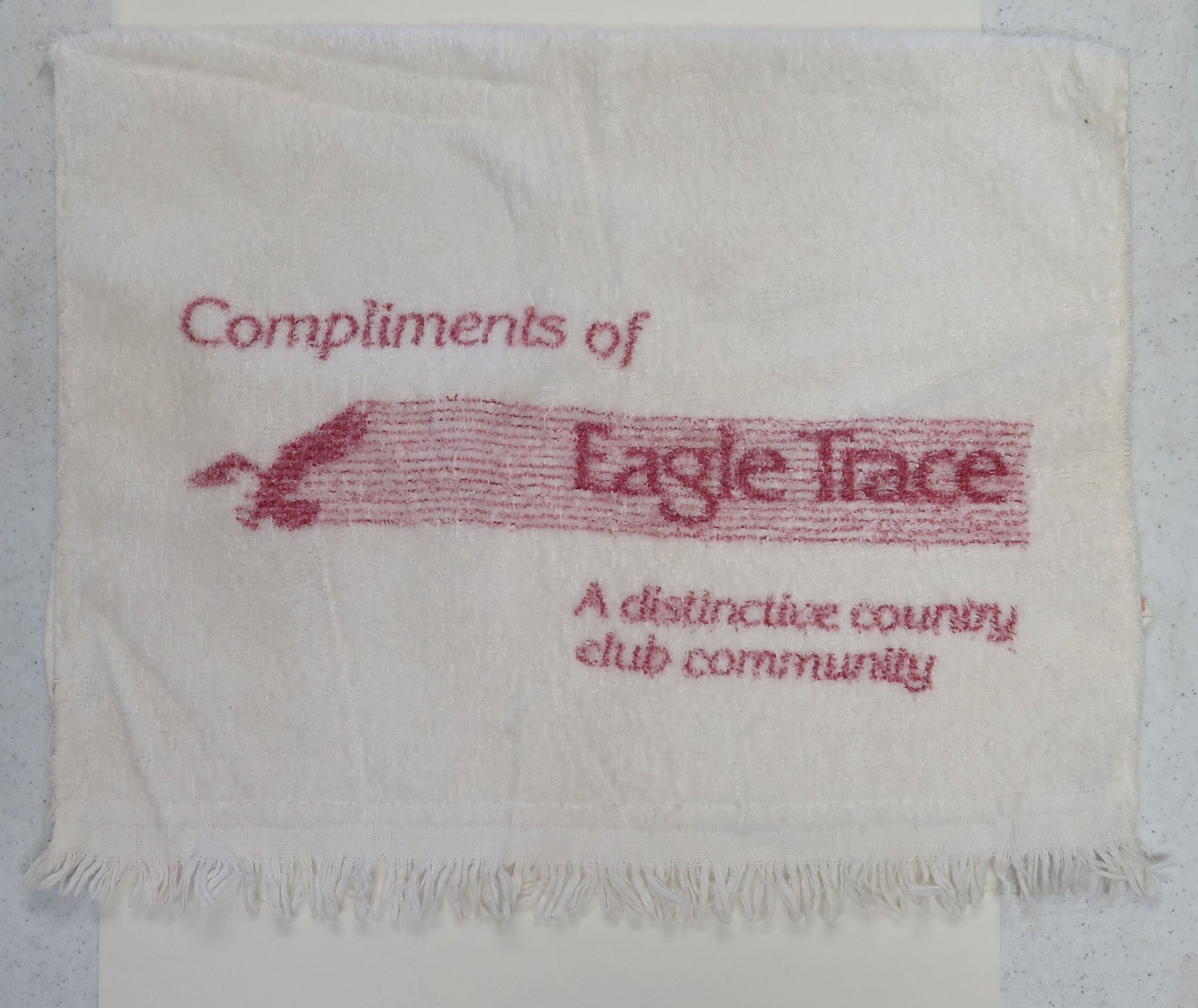 This is a white hand towel advertising Eagle Trace Country Club community. The towel measures 23"(H) x 15"(W).