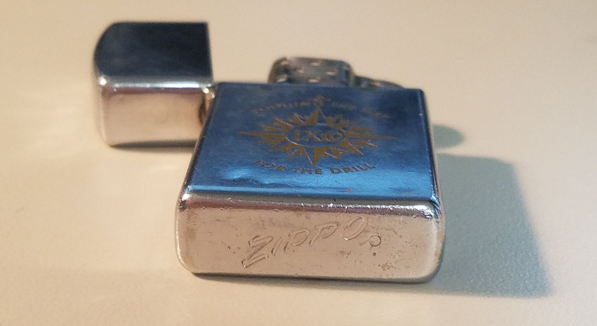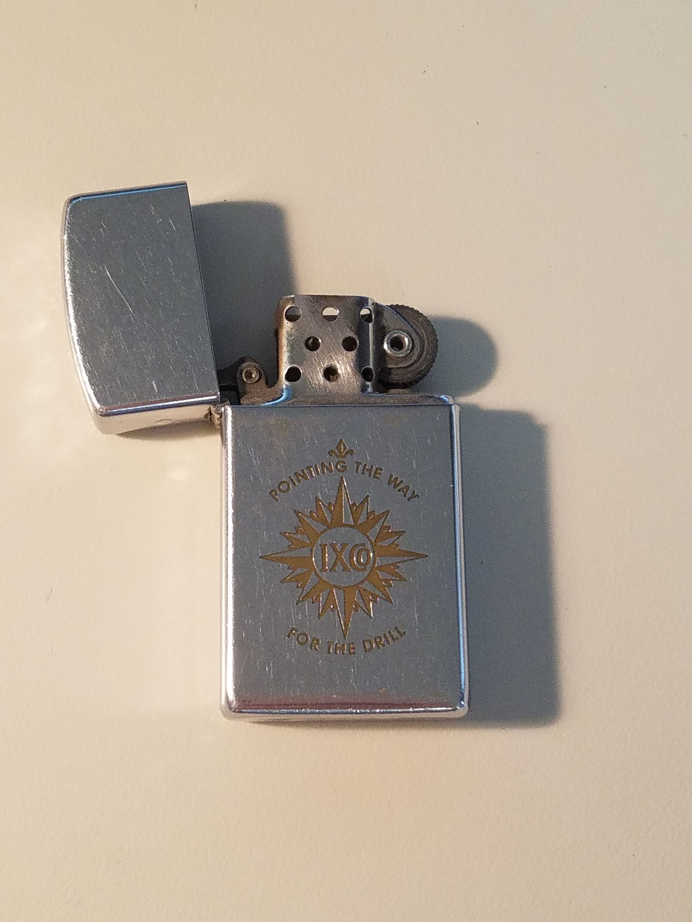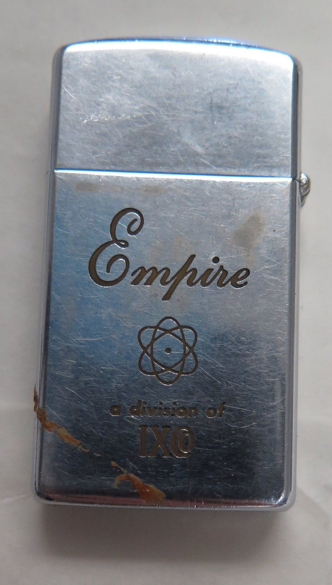 This is a metal lighter 2.25"(H) x 1.25"(W). Engraved on the front is "Empire a division of IXCo", on the bottom is "Zippo", and on the opposite side is "Pointing the way for the drill / IXCo"