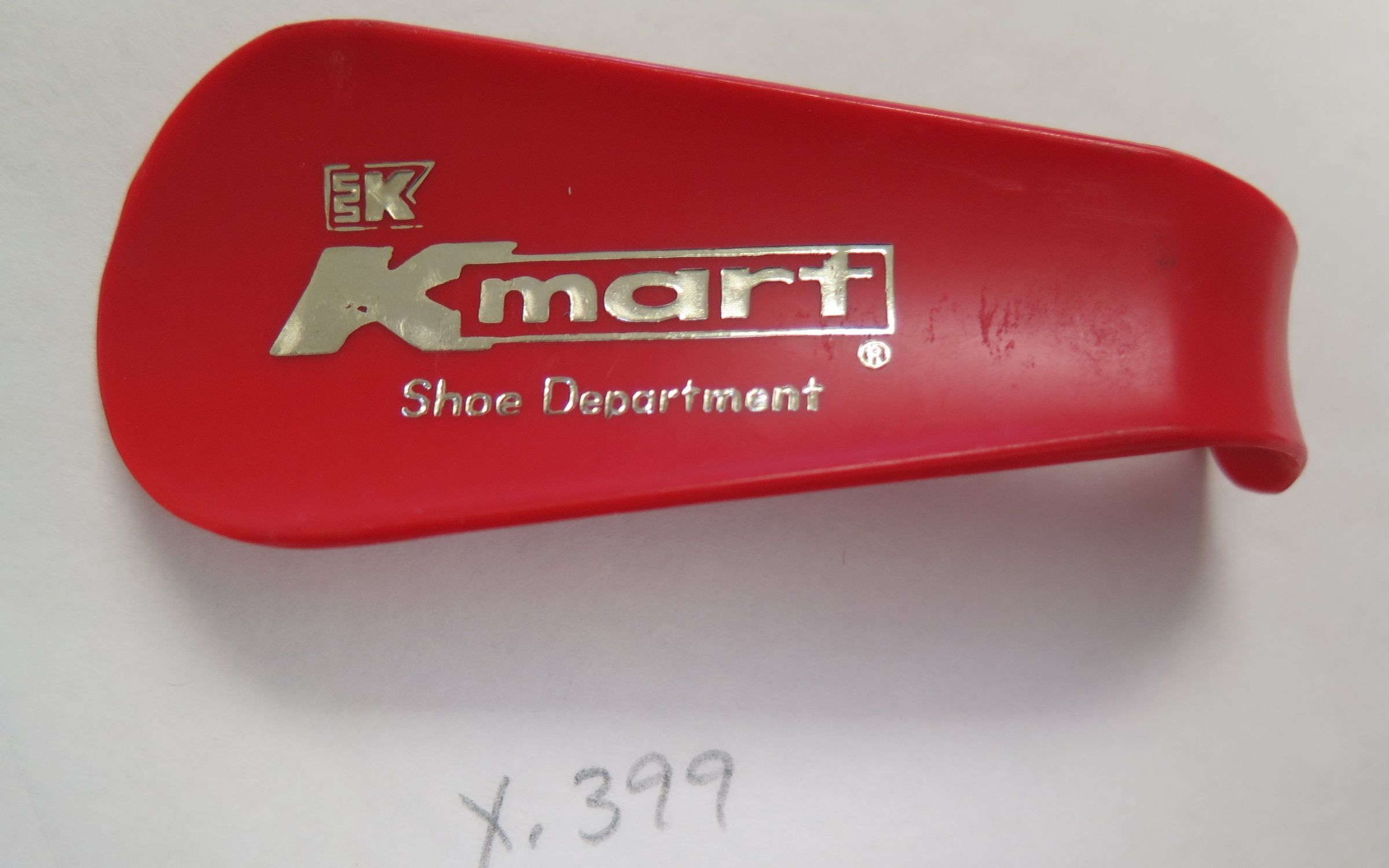 This is a red plastic shoehorn. 4.25"(L) x 1"(W). It has a Kmart logo printed on it in gold.