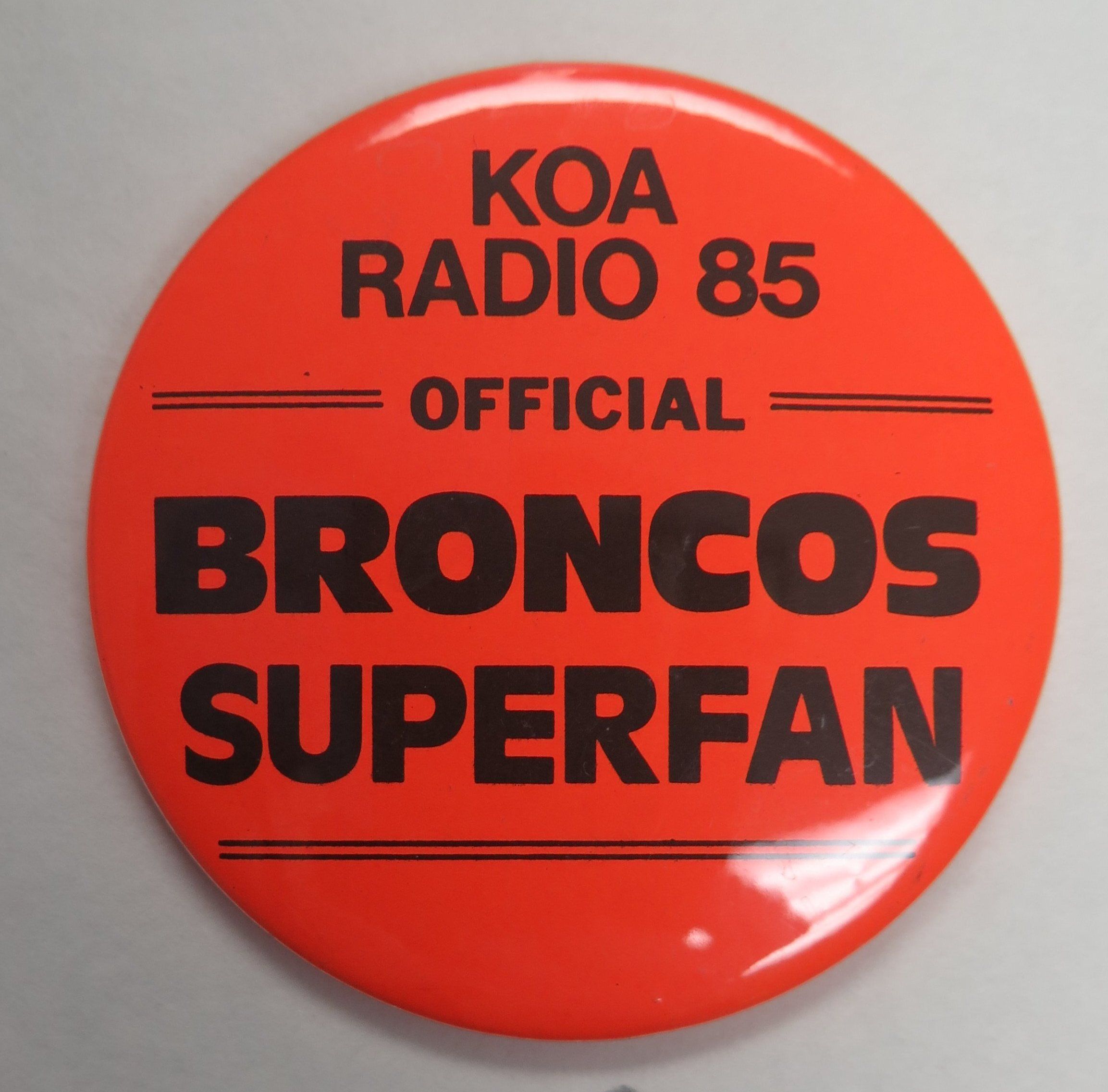 This is an orange button 3"(Dia) that has the following text: "KOA RADIO 85 OFFICIAL BRONCOS SUPERFAN"