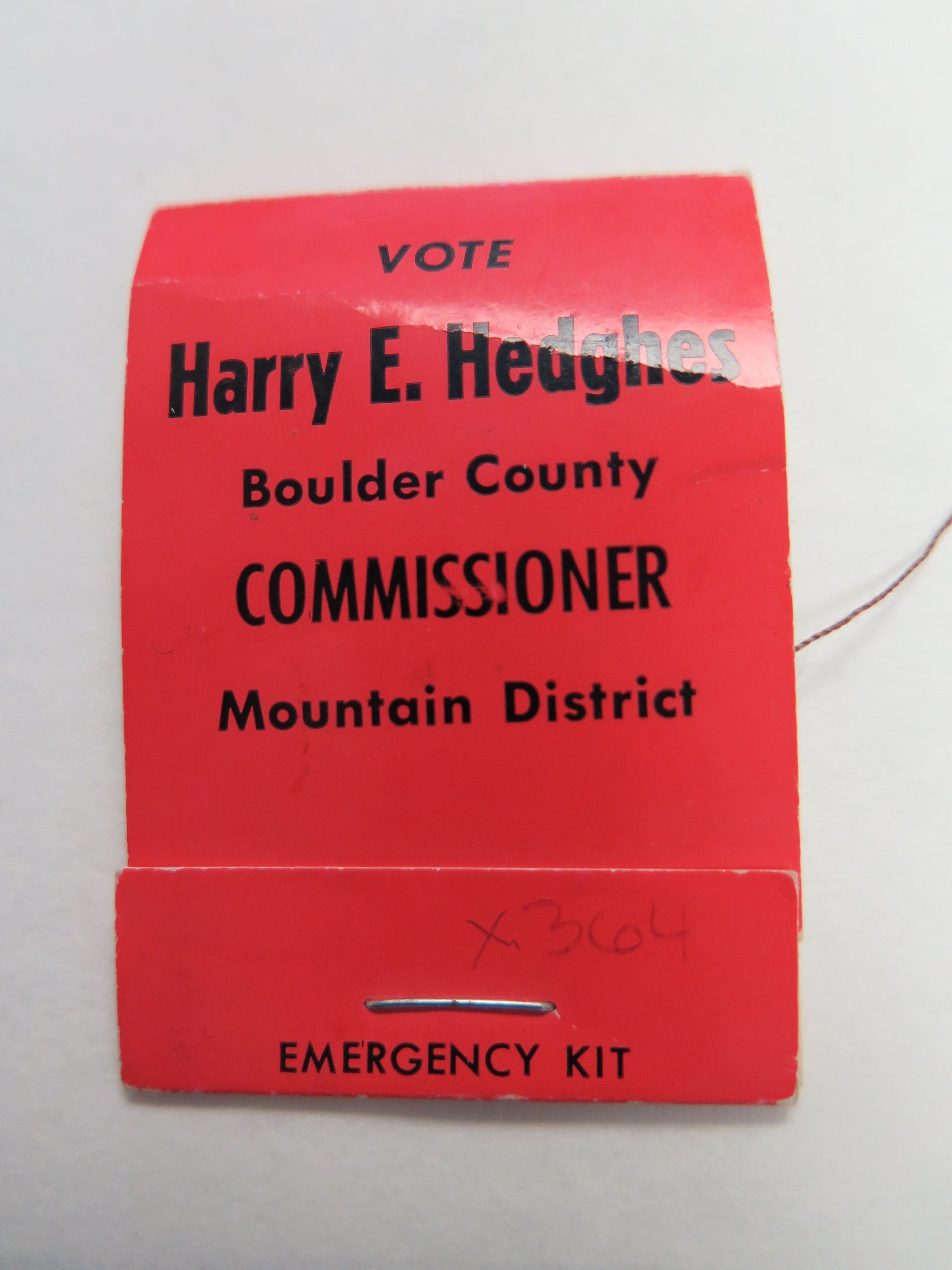 This is an emergency kit matchbook that promotes Harry E. Hughes for Boulder County Commissioner. 2.5"(H) x 1.5"(W) It is red in color and contains sewing supplies and a bandage.
