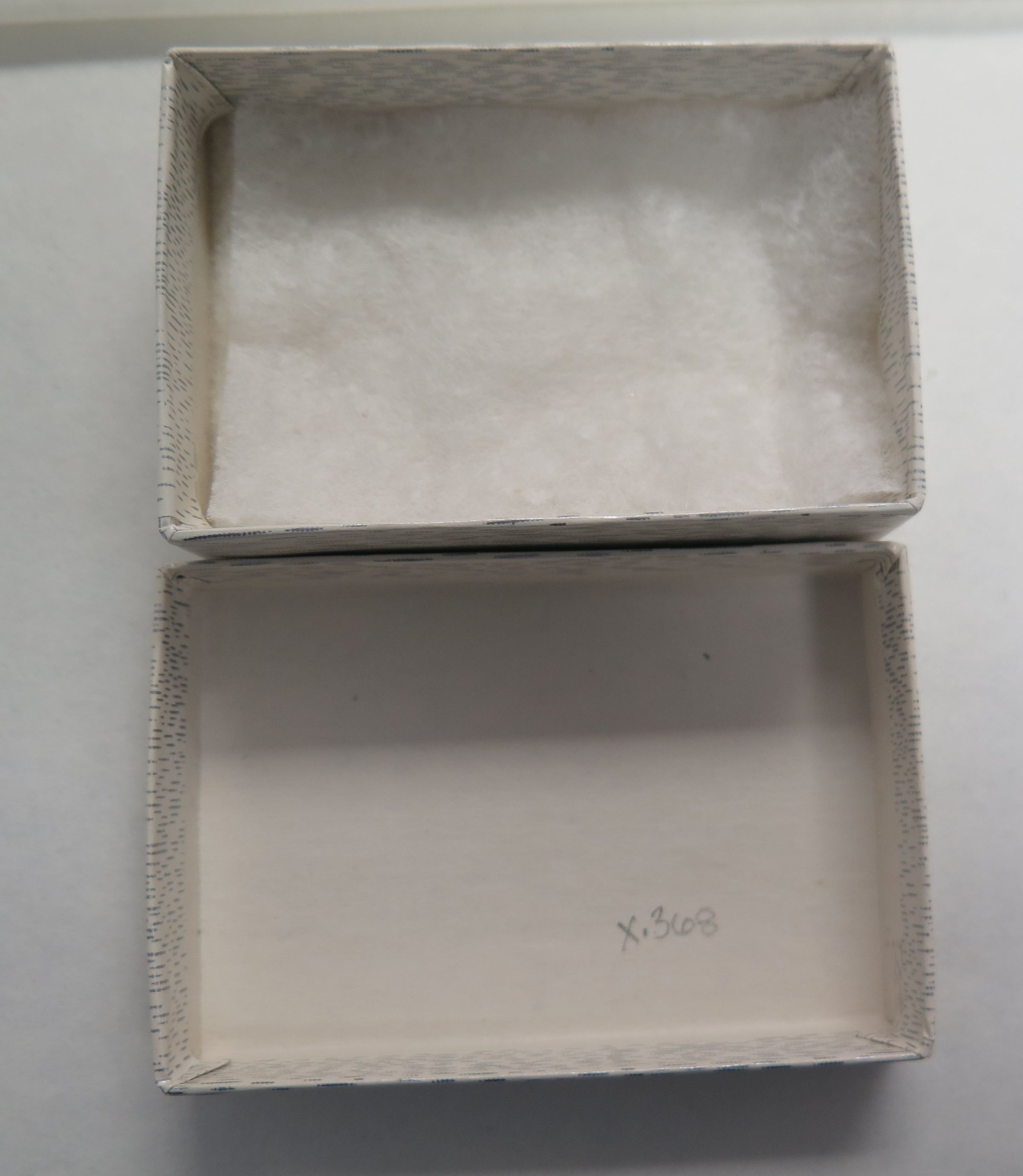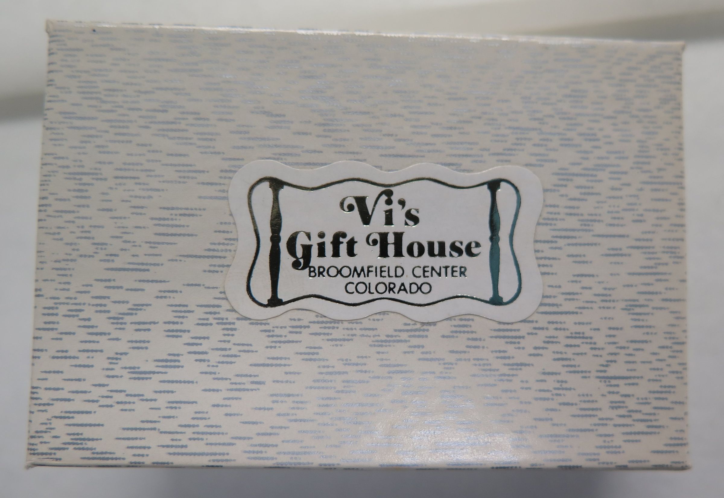 This is a white/silver paperboard gift box. 2.25"(H) x 3"(W) x 1.25"(D). The top of the box has a lable which reads: "Vi's Gift House".