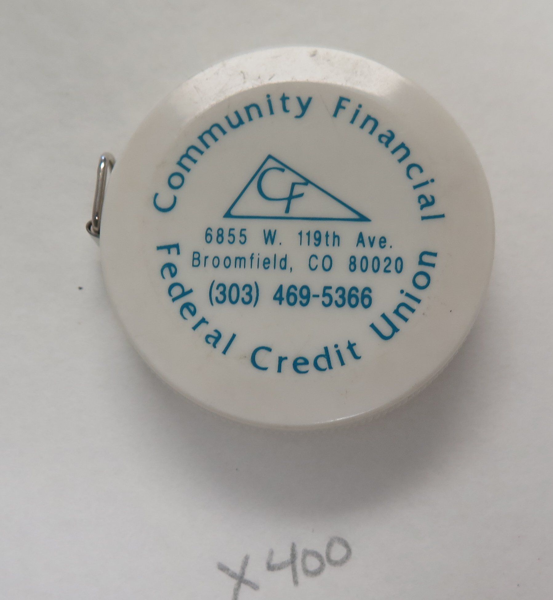 This is a white plastic retracable tape measure. 2"(Dia). It advertises Community Financial Federal Credit Union.