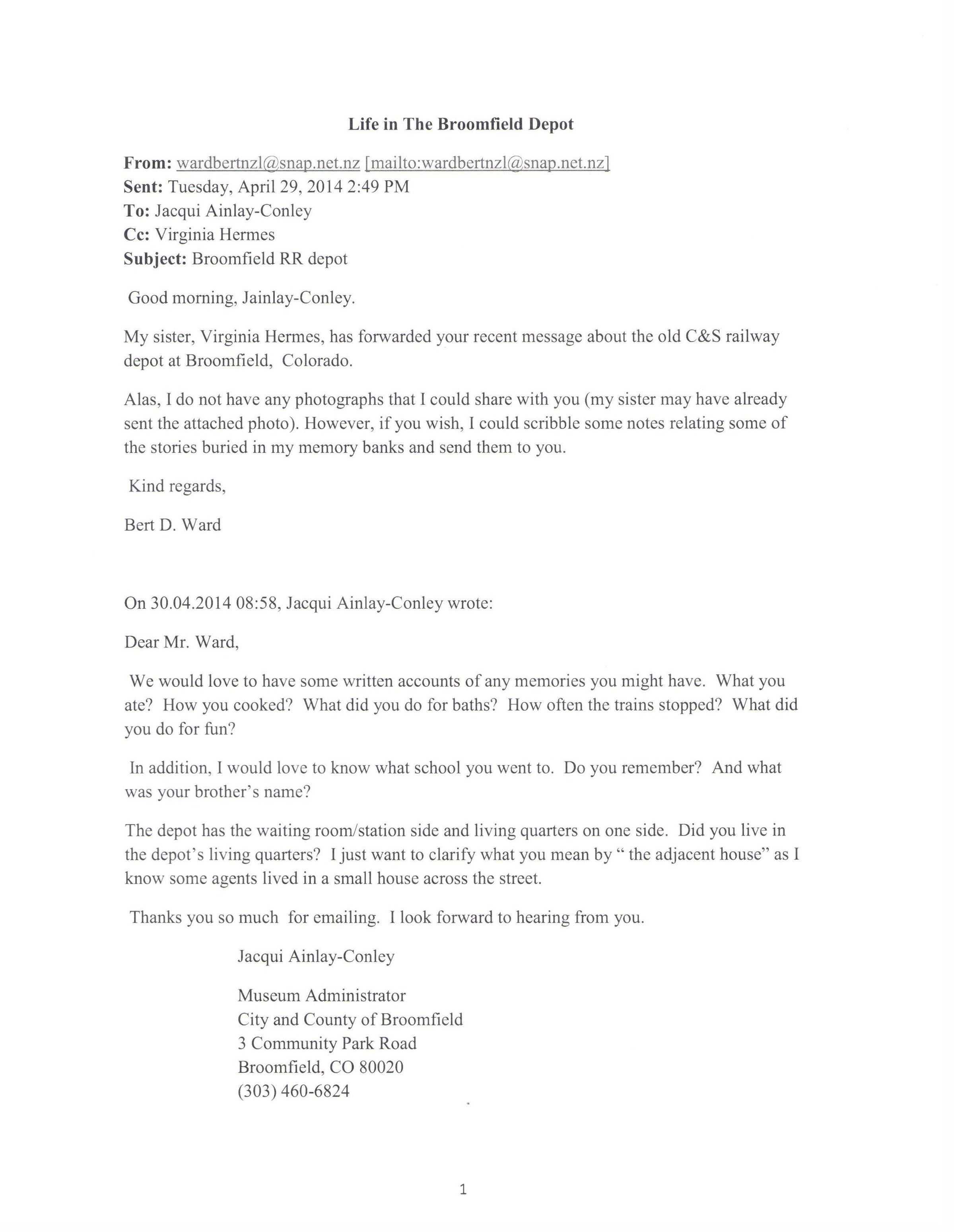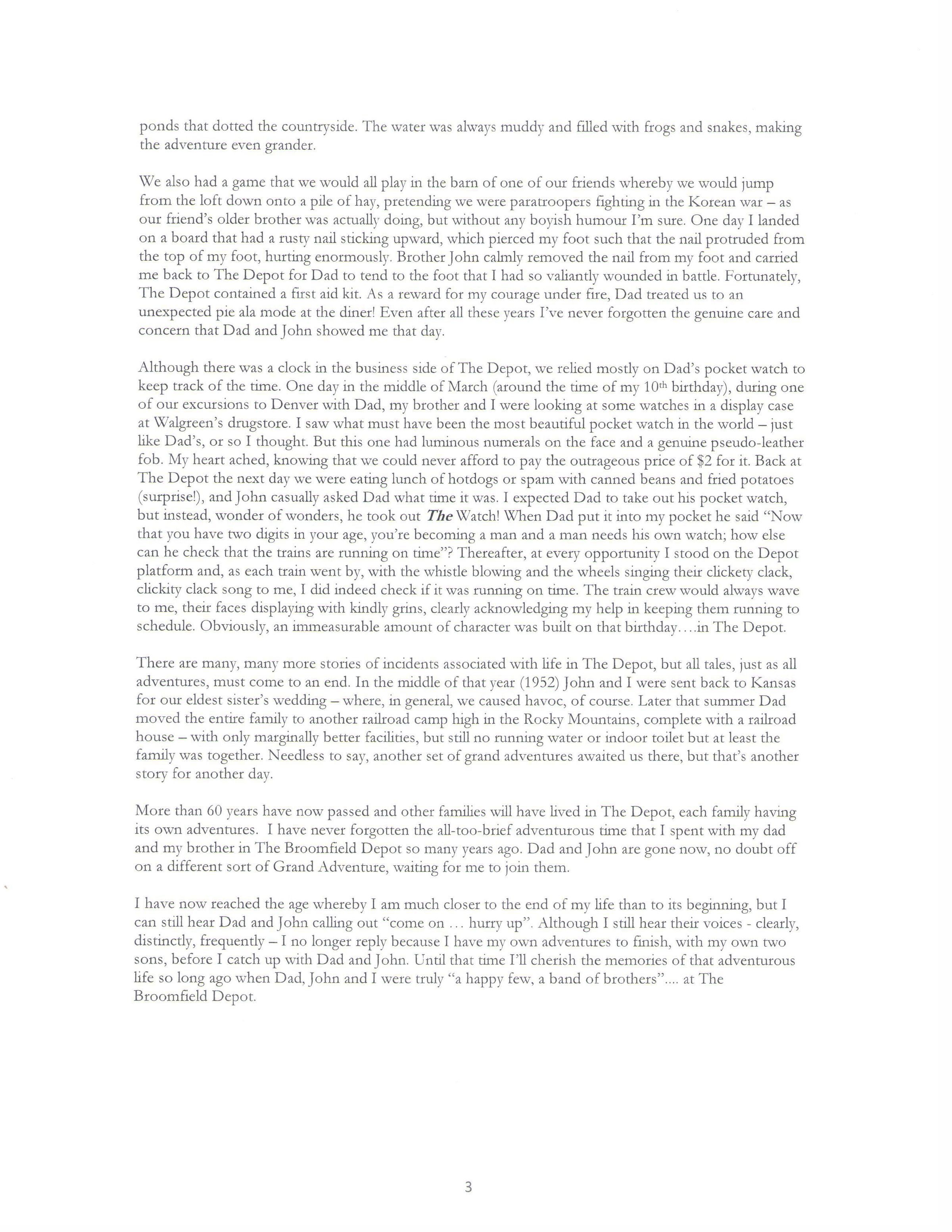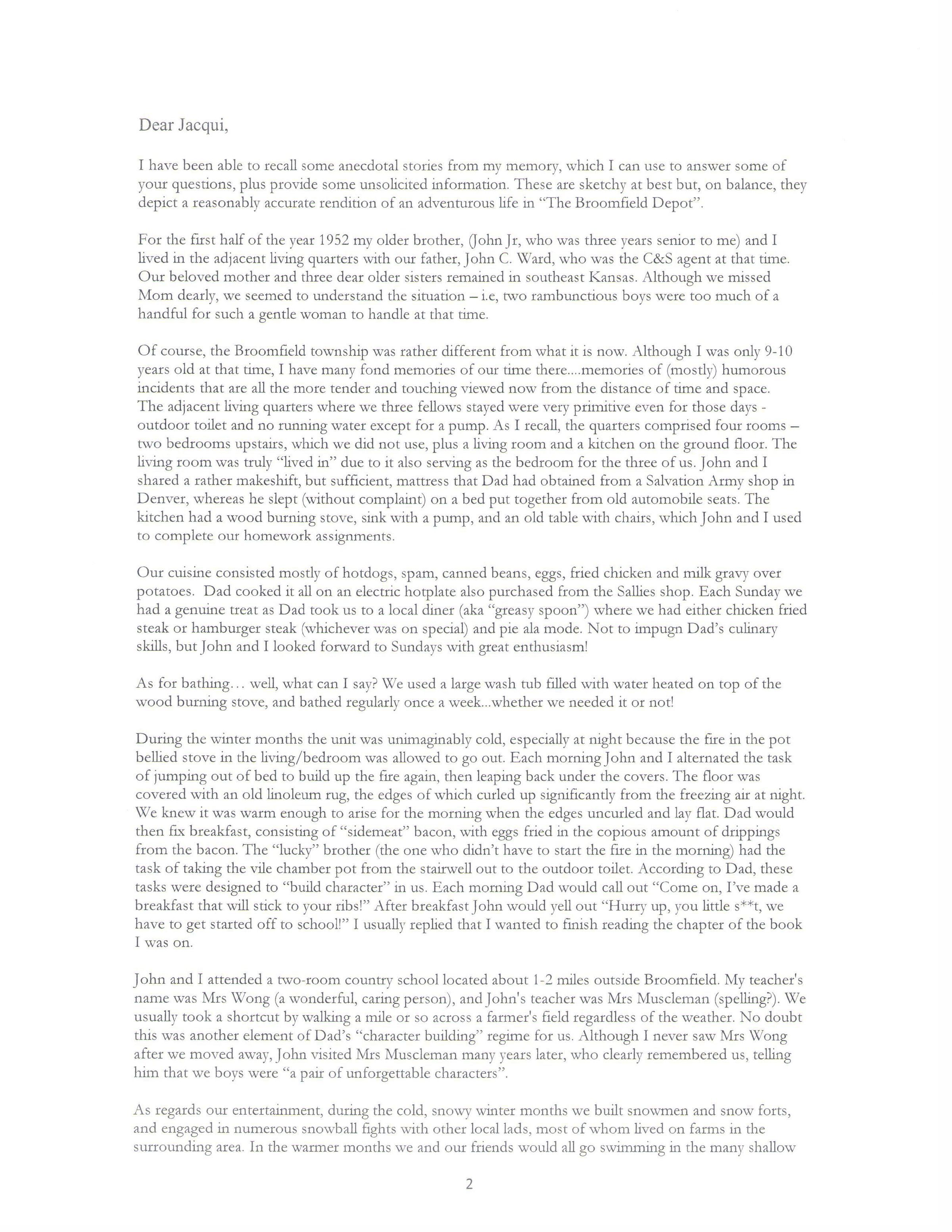 A three-page document of Bert Ward's reminiscences of living in the Broomfield Depot in 1952 while his father, John Ward III, a Colorado & Southern Railway station agent, was briefly assigned to Broomfield. Bert and his older brother John Calhoun Ward IV (known as John Ward, Jr.) lived in the depot with their father while their mother and three older sisters stayed in Kansas. Bert recounts aspects of their daily life including food, play, sleeping habits, and grooming.Collection