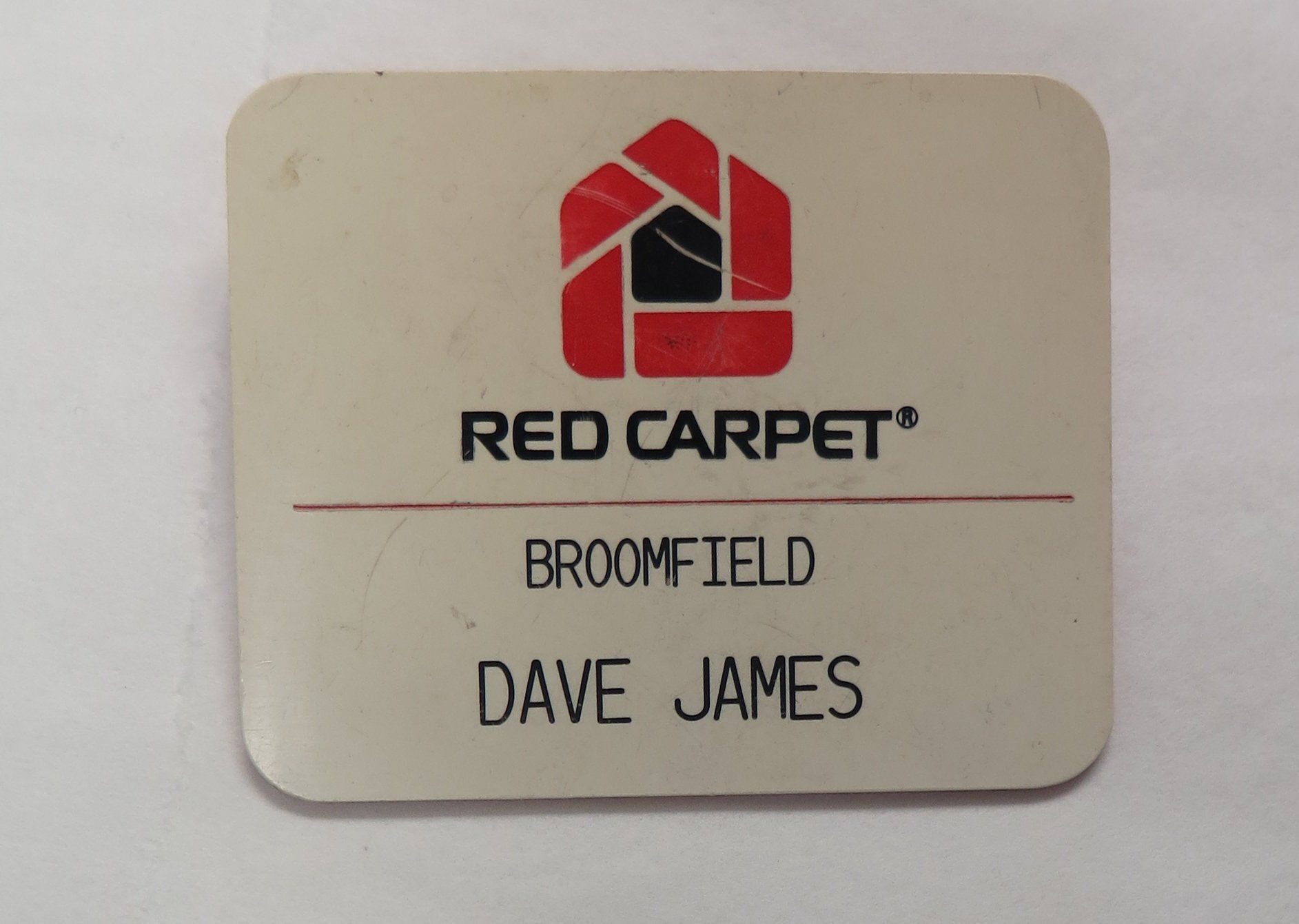 This is a white plastic name badge 2.75"(H) x 1.5"(W). On it is text which reads: "RED CARPET BROOMFIELD DAVE JAMES".