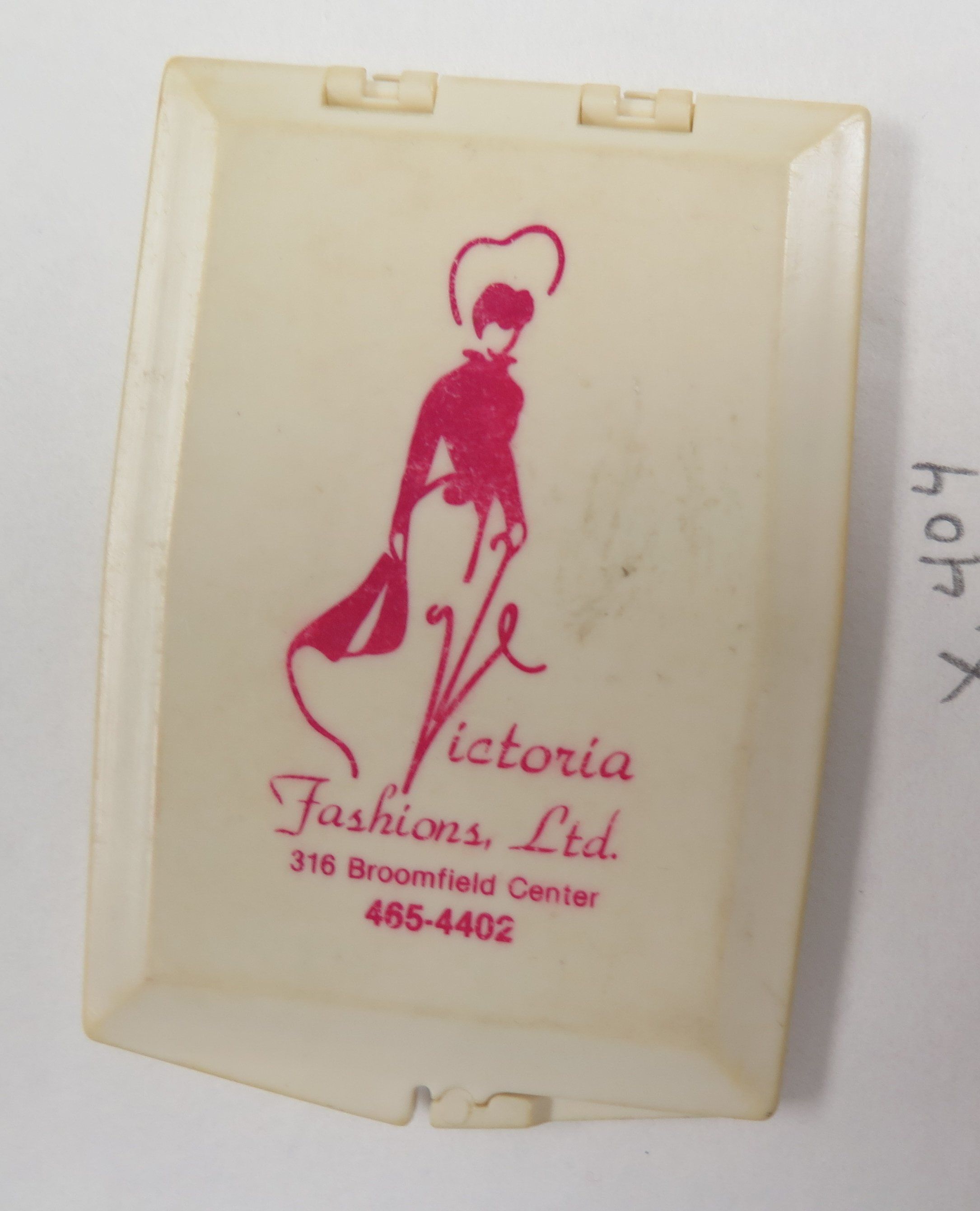 This is a white plastic makeup compact from Victoria Fashions Ltd. It has a hinged top with a stylized image of a woman in red and the text: "Victoria Fashions Ltd."