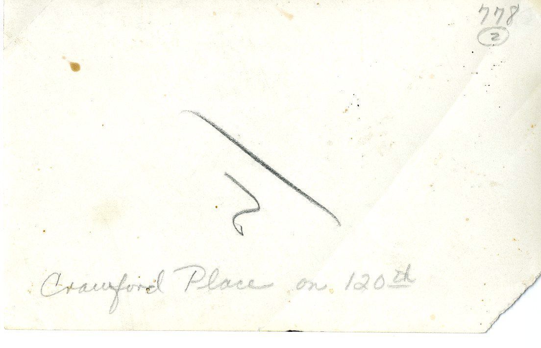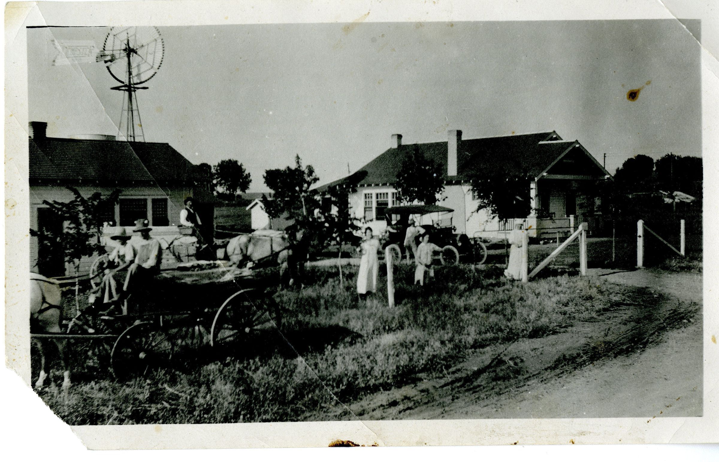 Photograph of the Crawford place on 120th. Has lots of people, has two horse drawn carts and a car. Windmill on the far left above building. Duplicate 2. Missing lower left corner.