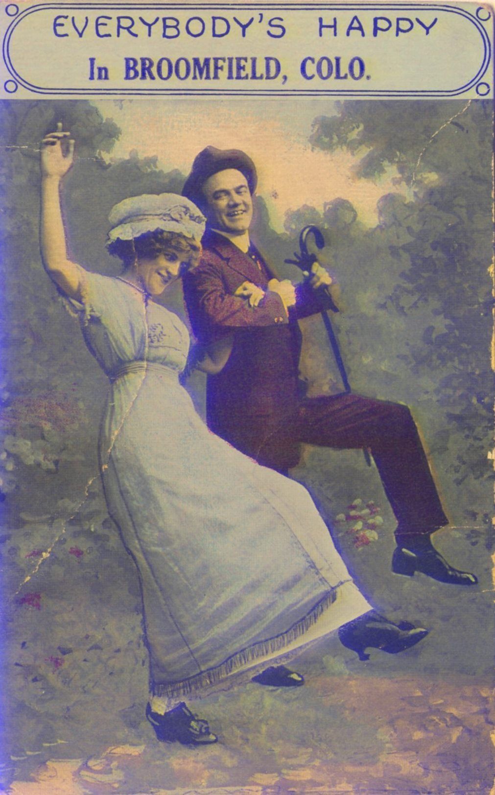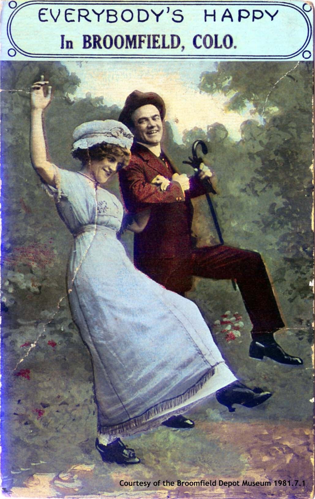 Picture post card from Broomfield, pre-1918. The Front reads "Everybody's Happy in Broomfield, Colo." The picture depicts a man and women skipping arm in arm in a wooded area. It appears to have been printed based from a mix of a black and white photograph and custom painting. The back is mostly blank, but with writing stating "Miss Vermeta Morgan Platteville Colo" in the space for address. Stamped with date and state, but obscured by space where postage stamp used to be.Collection
