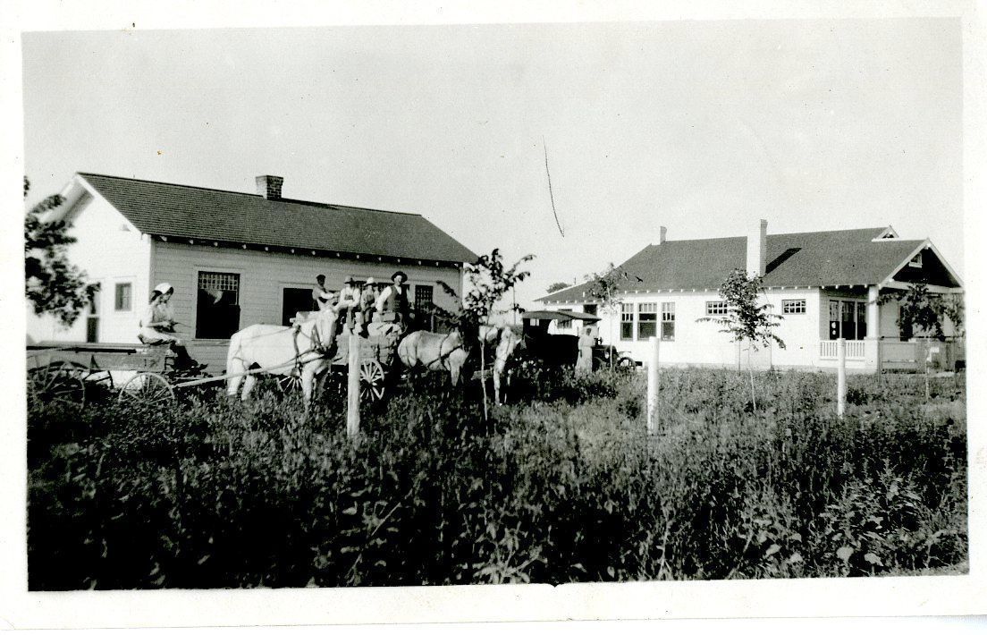 Crawford place on 120th ave. Five people and two horses are on the left half of the image partly covering a house.