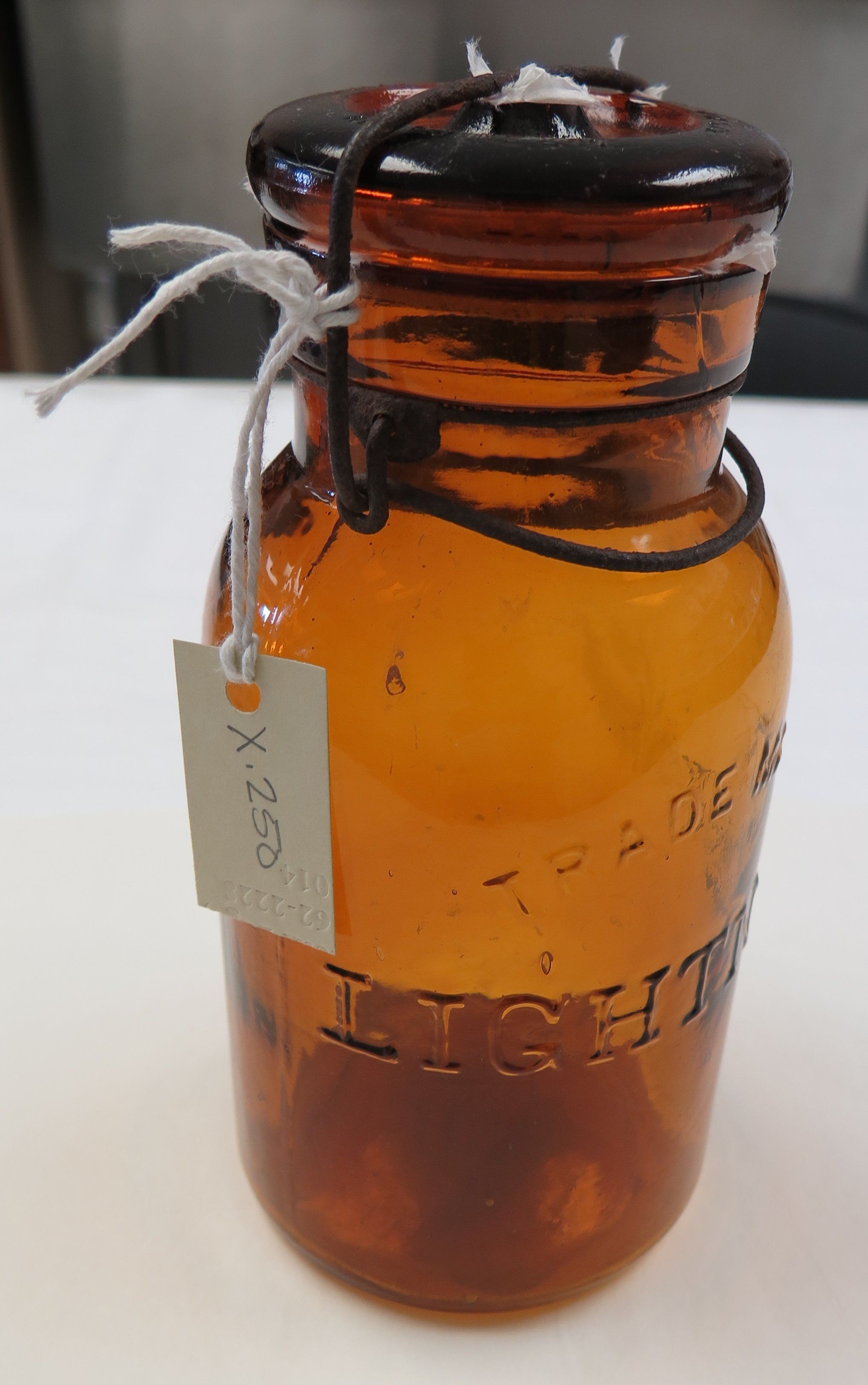 This is an amber glass Mason style Lightning jar. The jar has a matching glass lid held in place by a metal wire. The jar measures 8" (h) x 3.75" (dia).