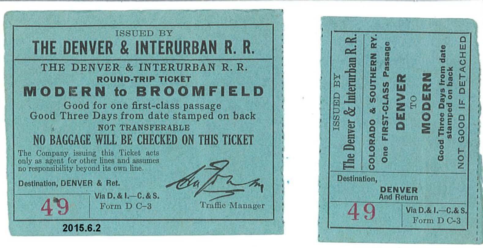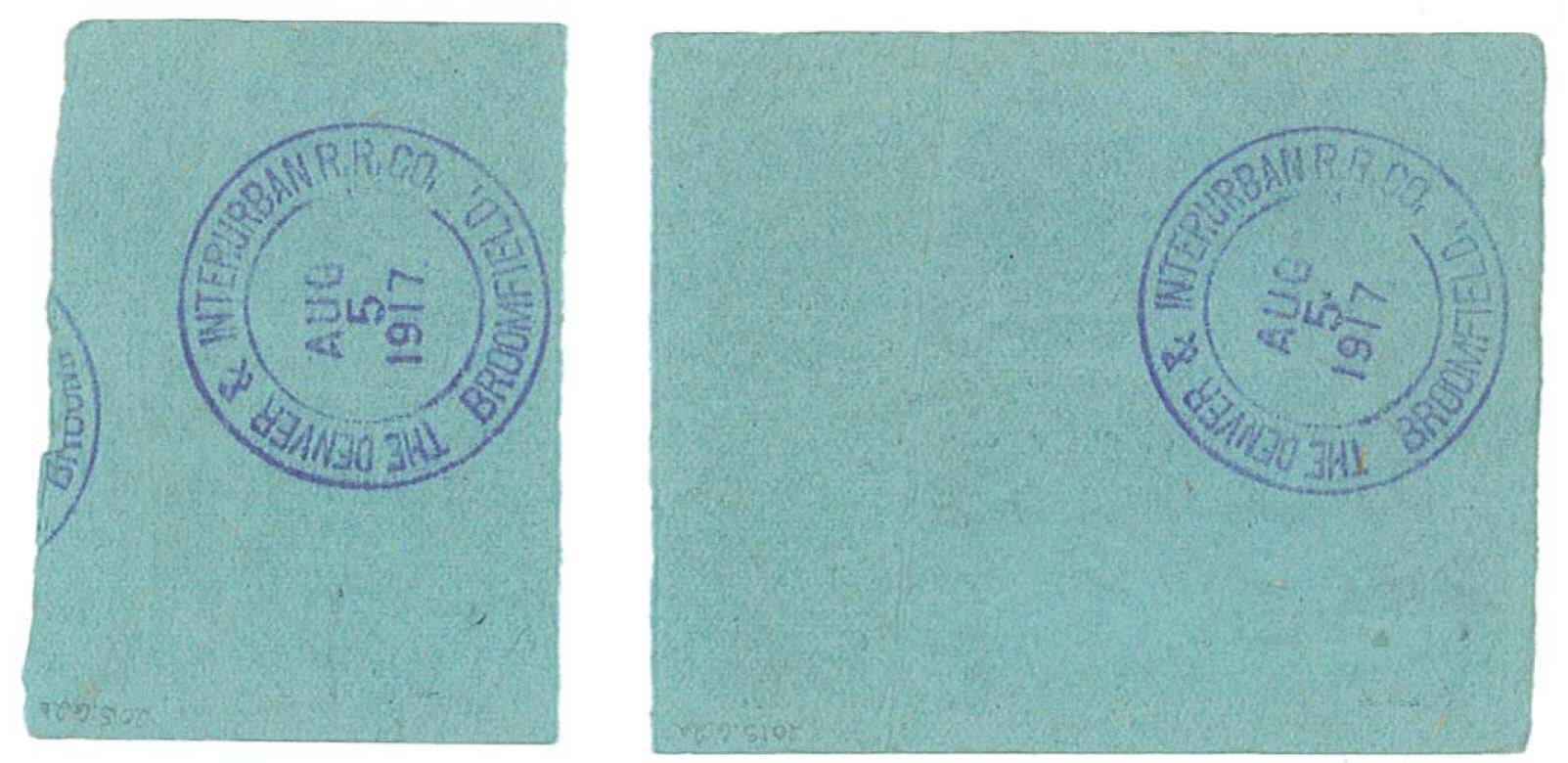One Denver & Interurban Railroad round-trip ticket and stub for a ride from Modern to Broomfield. Both sides of the ticket and stub are light blue. There is black text on the front spelling out the use of the ticket and there is a darker blue stamp on the back giving the date, August 5, 1917. The ticket and stub are detached from one another. The ticket is numbered a, the stub b.