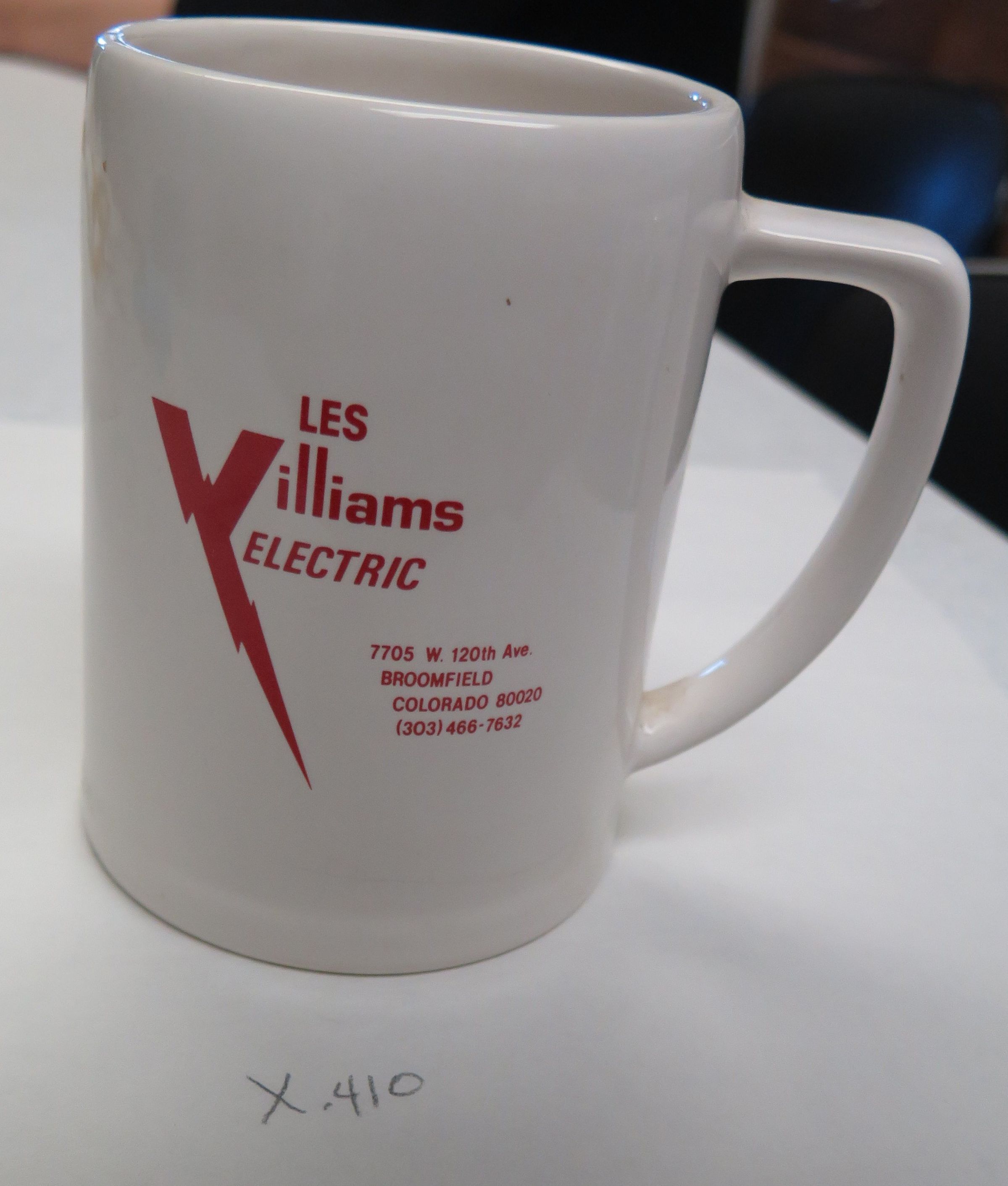 This is a white coffee mug with red lettering: "Les Williams Electric 7705 W. 120th Ave. BROOMFIELD COLORADO 80020 (303) 466-7632". 5"(H) x 5.25"(W).