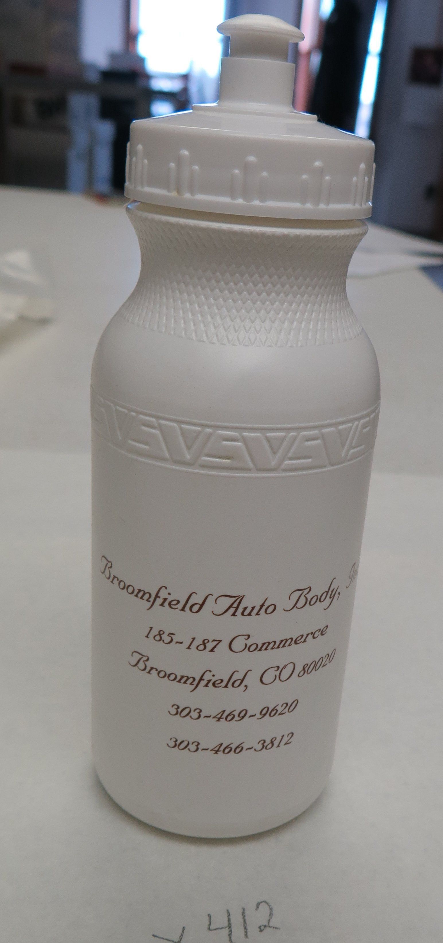This is a white plastic water bottle advertising Broomfield Auto Body. 8"(H) x 2.5"(W0