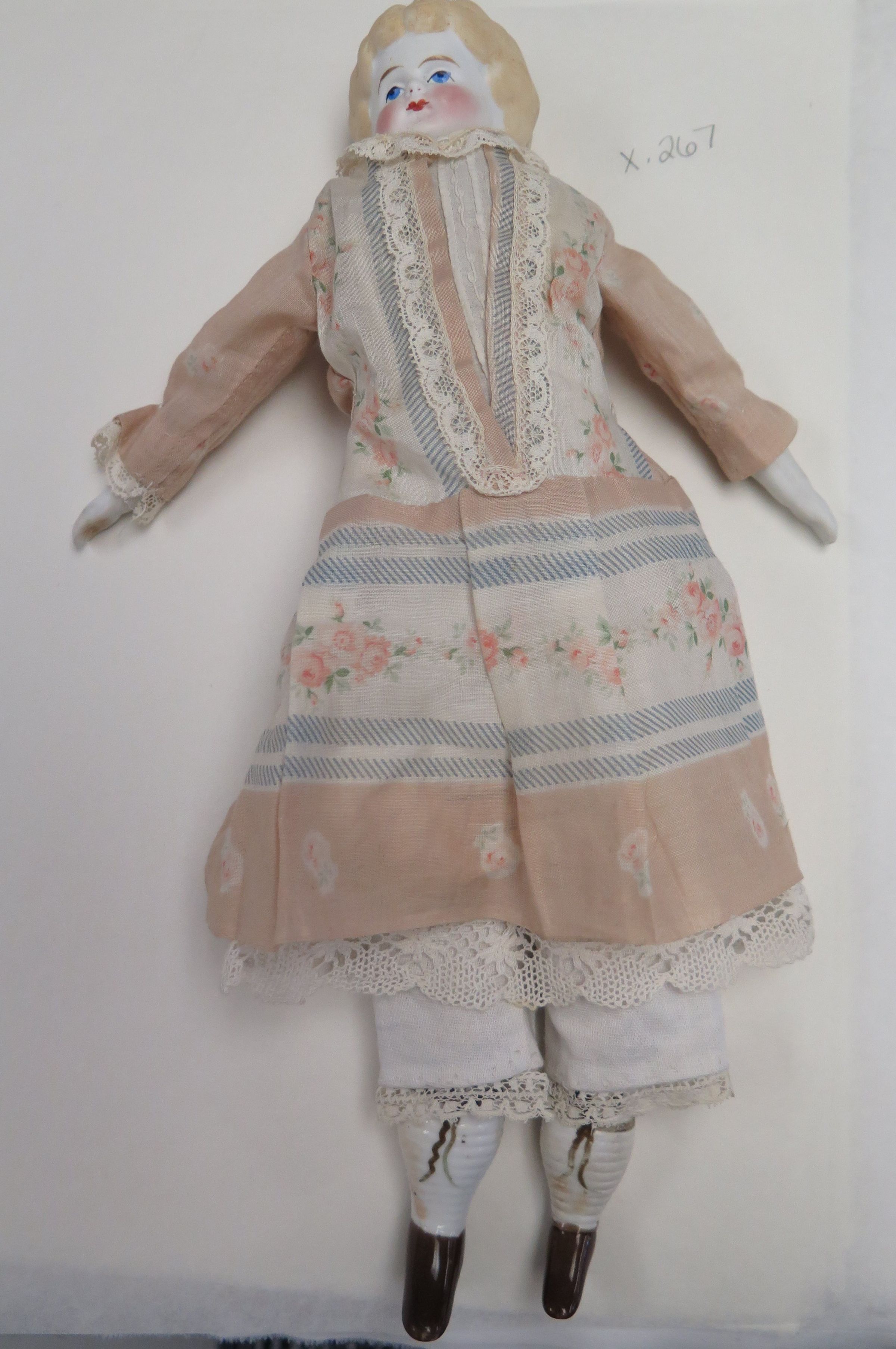This is a blonde porcelain doll with a swivel head. The doll is wearing a peach dress with white ruffles on it. The doll measures 1.75" (h) x 4.75" (w) x 12" (l).