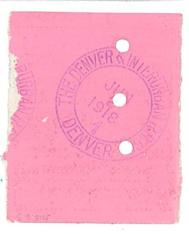 One Denver & Interurban Railroad ticket stub/coupon for Sunday admission to Eldorado Springs Resort. This coupon is light blue with black text on the front, the back is bright pink with a stamp giving the date. There are three holes through the ticket in a line near the center.