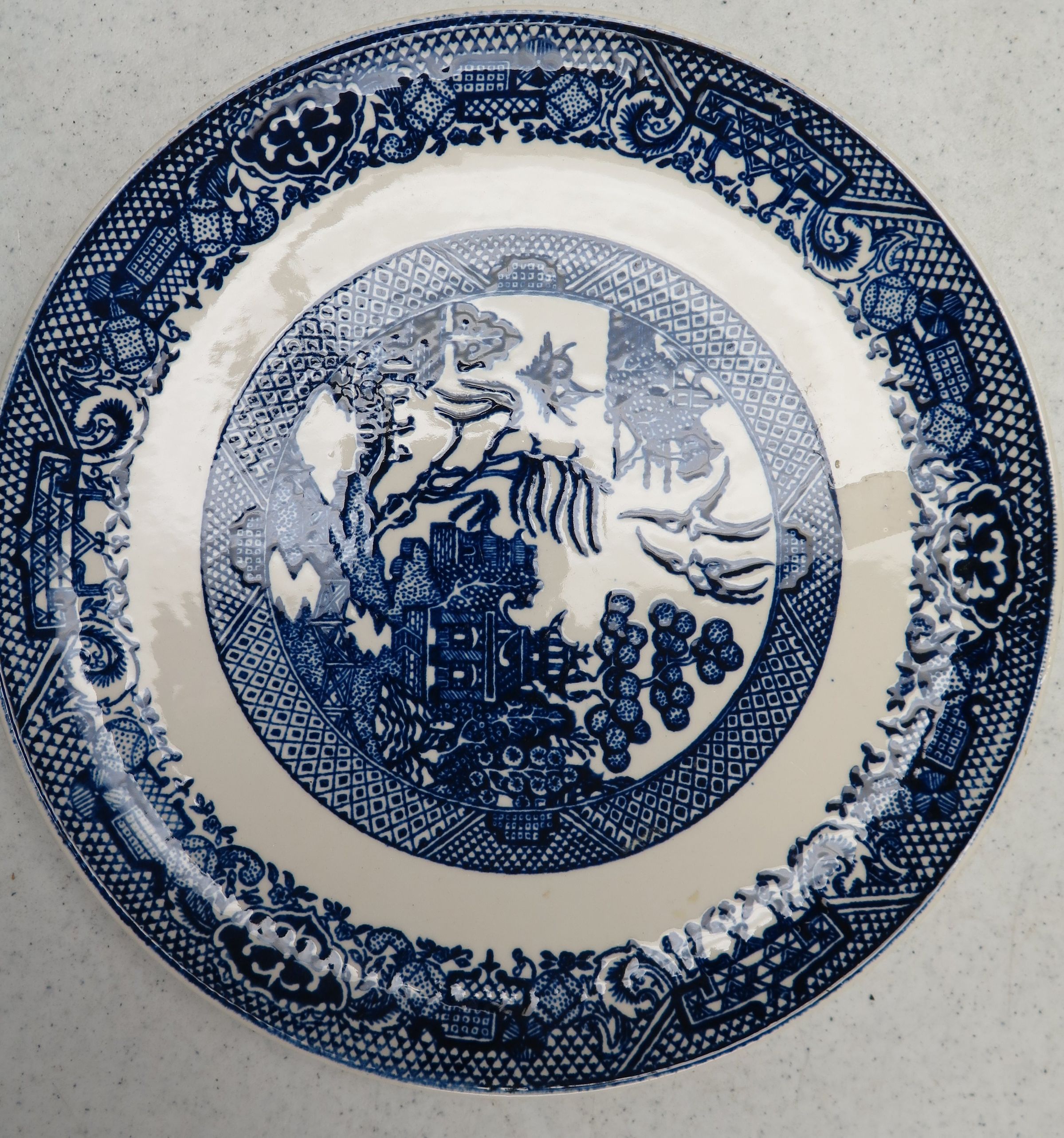 This is a white ceramice decorative plate with a dark blue transfer pattern on the edge and a stylized outdoor scene in the center of the same transfer color.