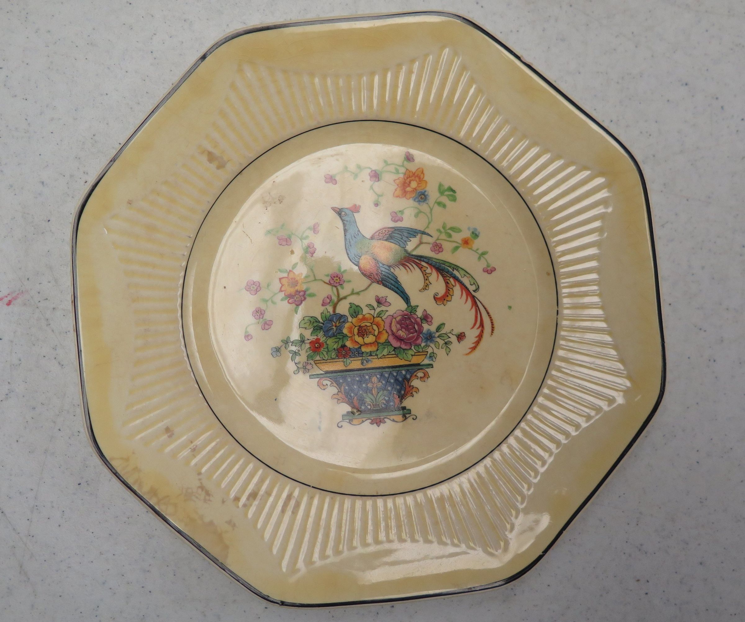 This is an eight-sided off-white decorative plate 8"(Dia). It has decorative transfer in the center depicting a bird of paradise atop a bowl of fruit.