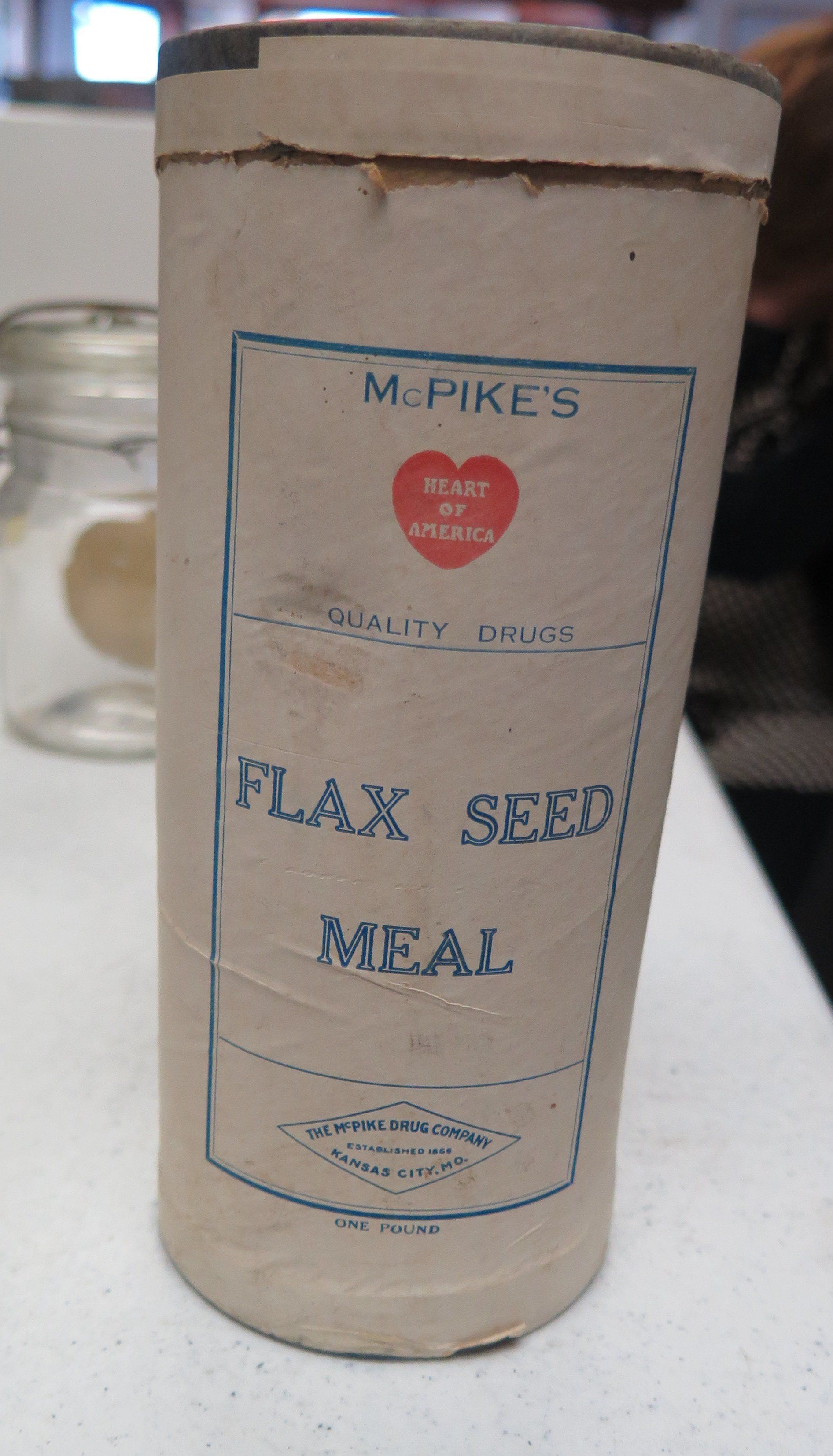 This is a cardboard container of flax seed meal. The package is white with blue text. The package is made by McPike's, and it originally contained 1 pound of product. The package measures 7.5" (h) x 3.5" (dia).Collection
