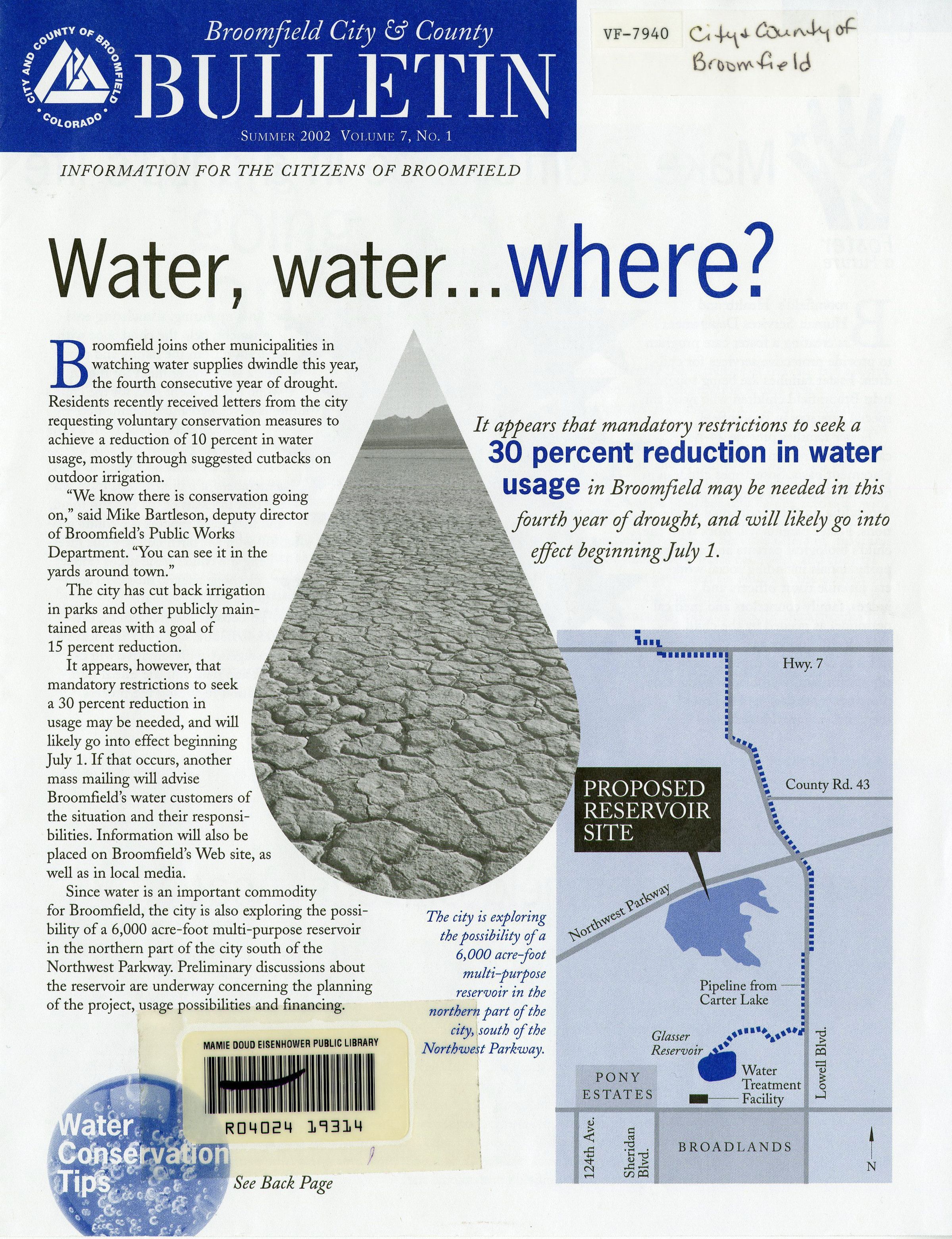 Volume 7, number 1 publication of the Broomfield City and County Bulletin. Published for summer 2002. Sections include Water, water where?, how residents can help revisit Broomfield's Strategic and Master Plans, making a difference in a child's life, viewing professional fireworks displays, concern over mountain wildfires, and tips for conserving water.Lexicon