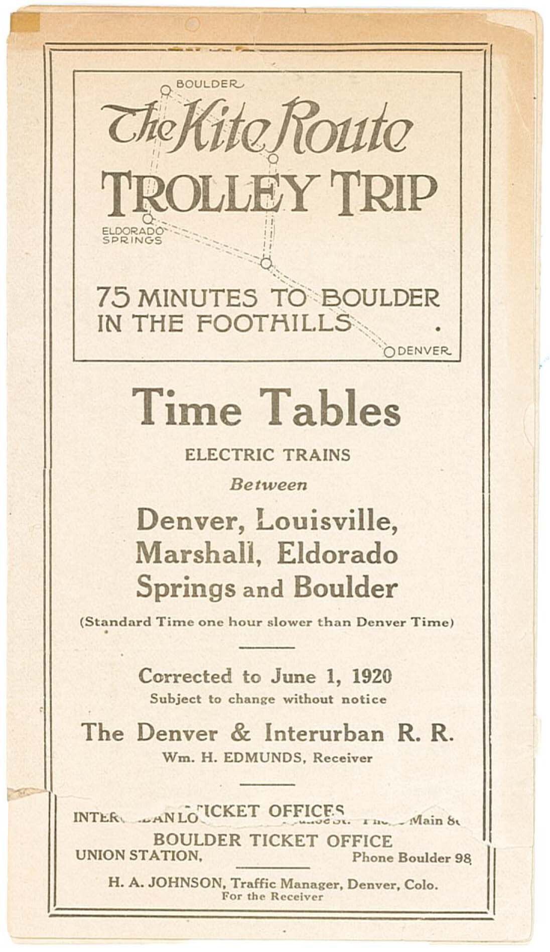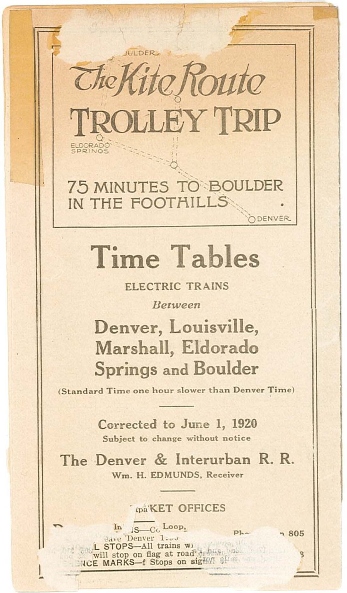 A small pocket sized timetable/schedule for the Denver & Interurban Railroad "Kite Route Trolley Trip," from June 1, 1920. The front of the schedule advertises quick trips starting from Denver in "75 minutes to Boulder in the Foothills." Cities in the schedule include Denver, Louisville, Marshall, Eldorado Springs, Boulder, and Globeville. It is cream colored with black text and has four pages which are folded in half to form the booklet. Parts of the schedule have been ripped off.Collection