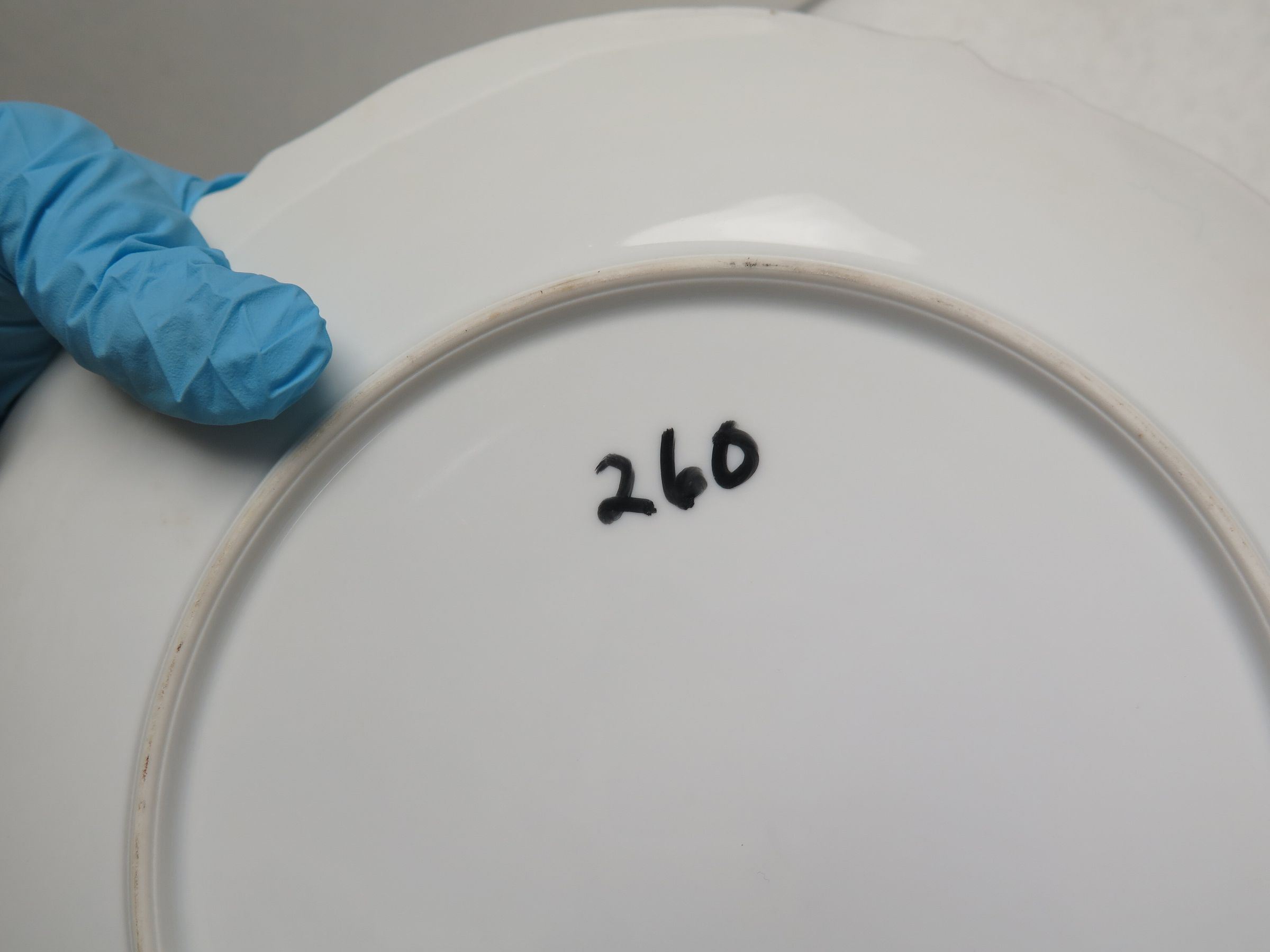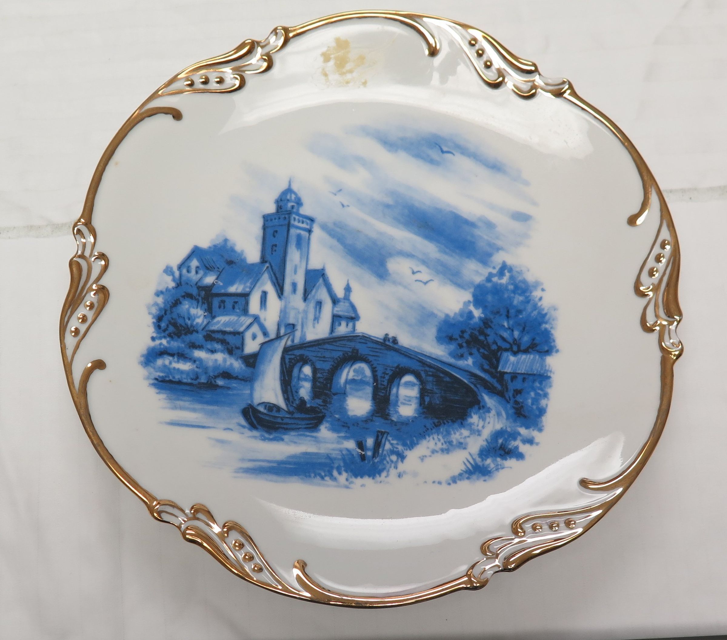 This is a 10.25"(Dia) white ceramic decorative plate with a gold rim. There is a scene of a castle and bridge in blue on the front.