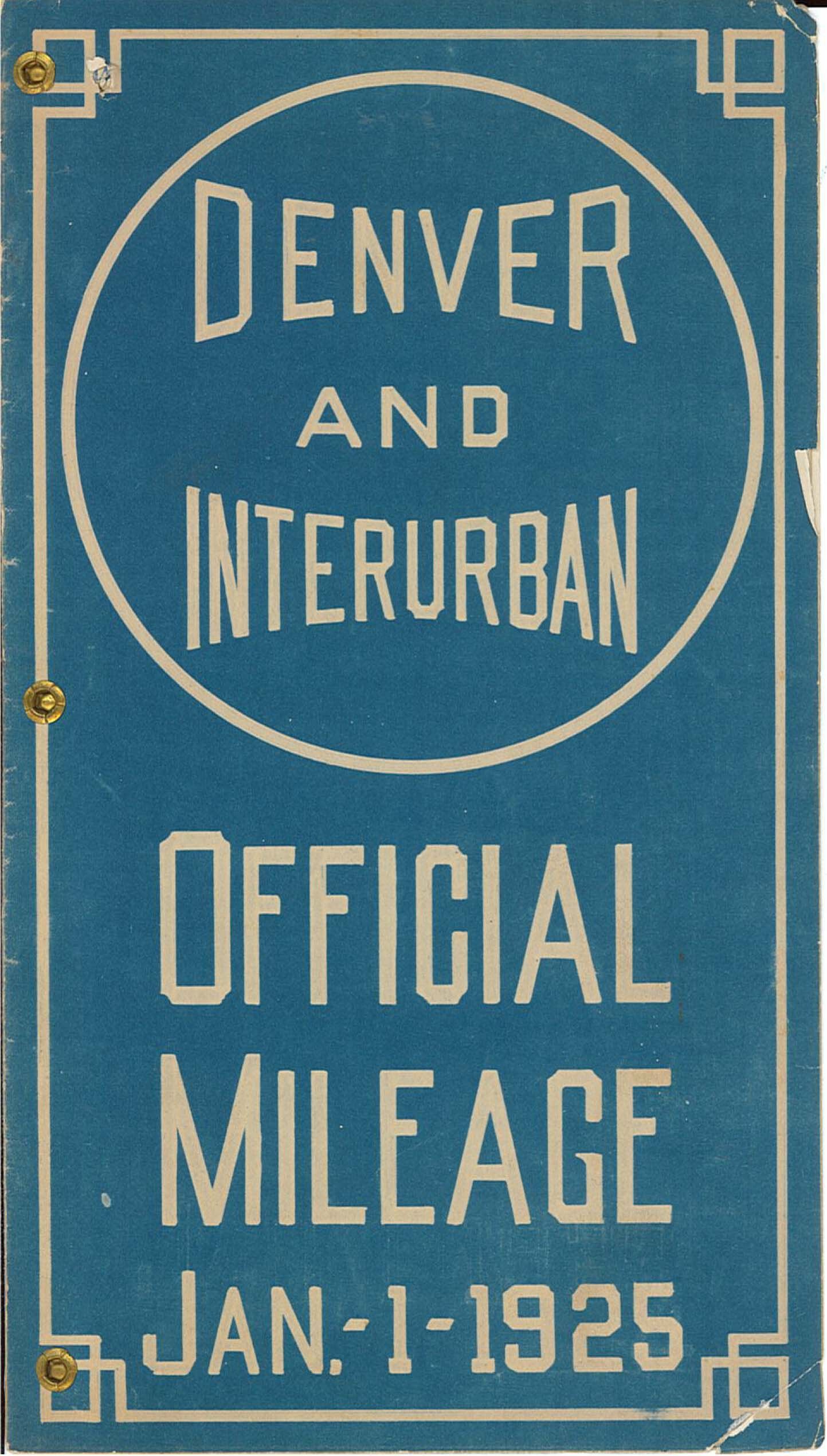 A six page booklet recording the official mileage of the Denver & Interurban Railroad, dated January 1, 1925. The mileage is by line, designating distance from Denver at various stops, junctures, and depots. Three metal brads hold together the pages at the spine. The front and back cover is dark blue with white text.
