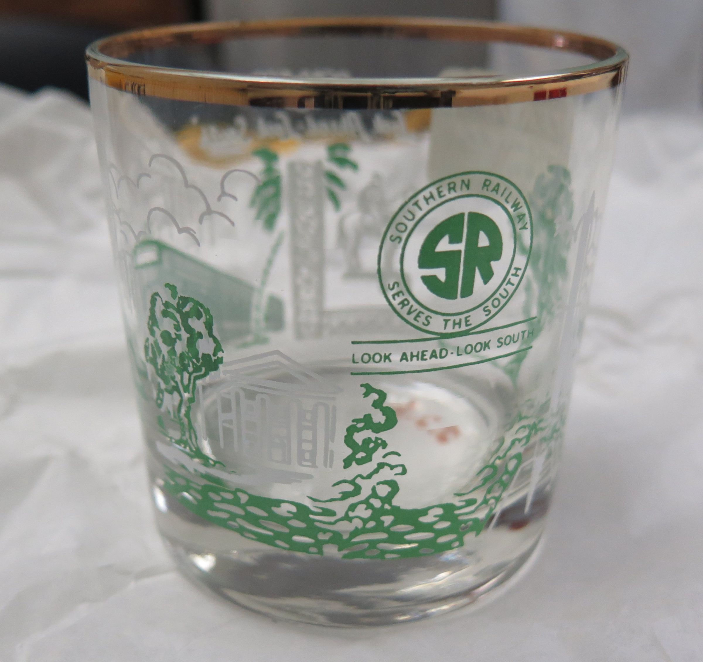 This a clear glass drinking glass, possibly a whiskey glass. The glass has green graphics and text on it advertising for the Southern Railroad. The text reads, "Southern Railway/ Serves the South/ Look Ahead. Look South". The glass measures 3.5" (h) x 3.25" (dia).