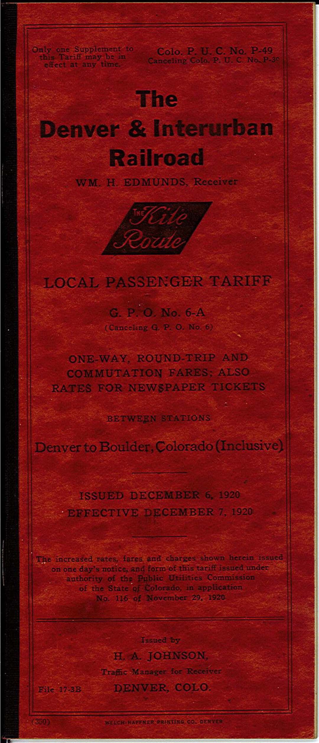 This is a Denver & Interurban Railroad local passenger tariff no.6-A listing "one way, round trip and commutation fares; also rates for newspaper tickets." Trips were from Denver to Boulder along the Kite Route. It was used by station agents or conductors to sell tickets at the correct price.