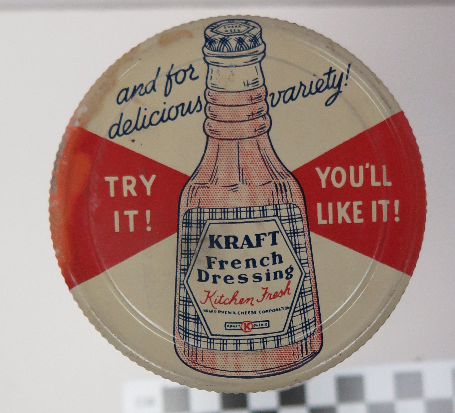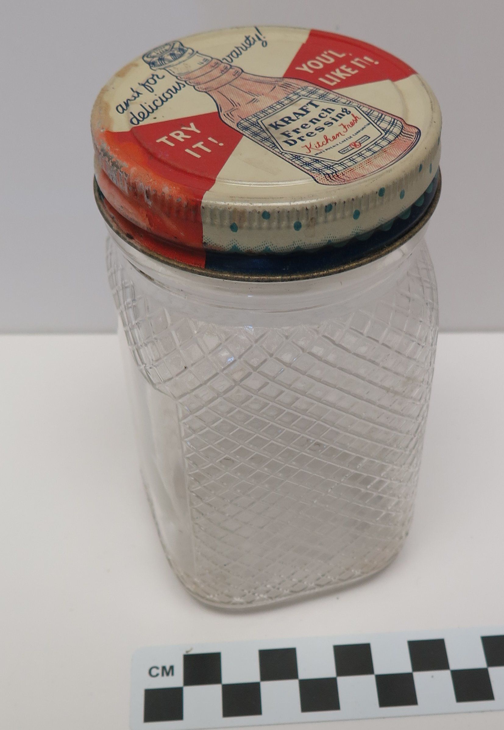 This is a clear glass jar with a metal screw lid. The glass is moulded with a diamond pattern on its sides. The lid is red and white with an image of a tall-necked bottle. Text on the lid reads: "And for delicious variety Try It! You'll Like it!" The bottle image has the text: "Kraft French Dressing Kitchen Fresh". 4.875"(H) x 2.75(W) x 2.75(D)