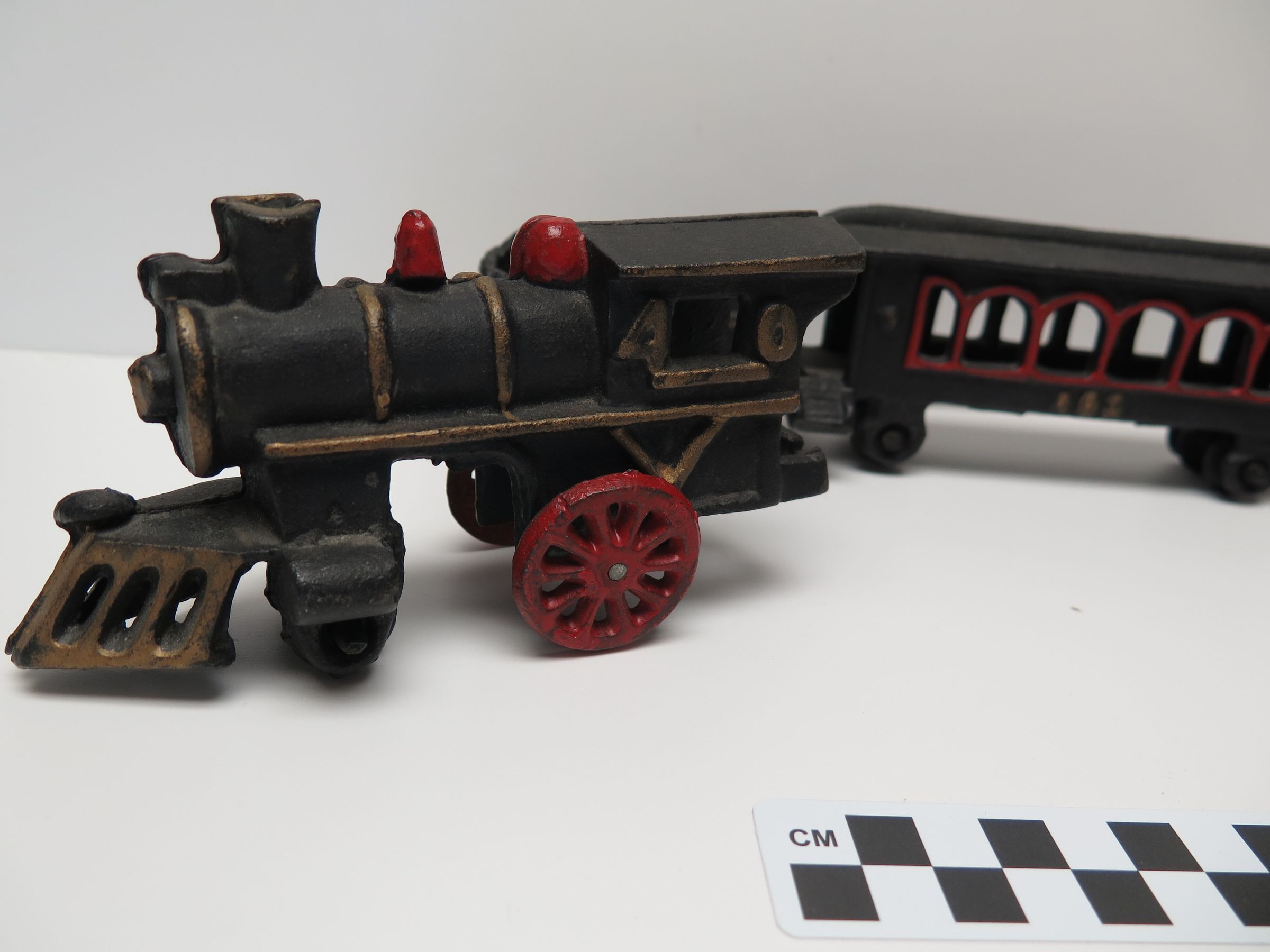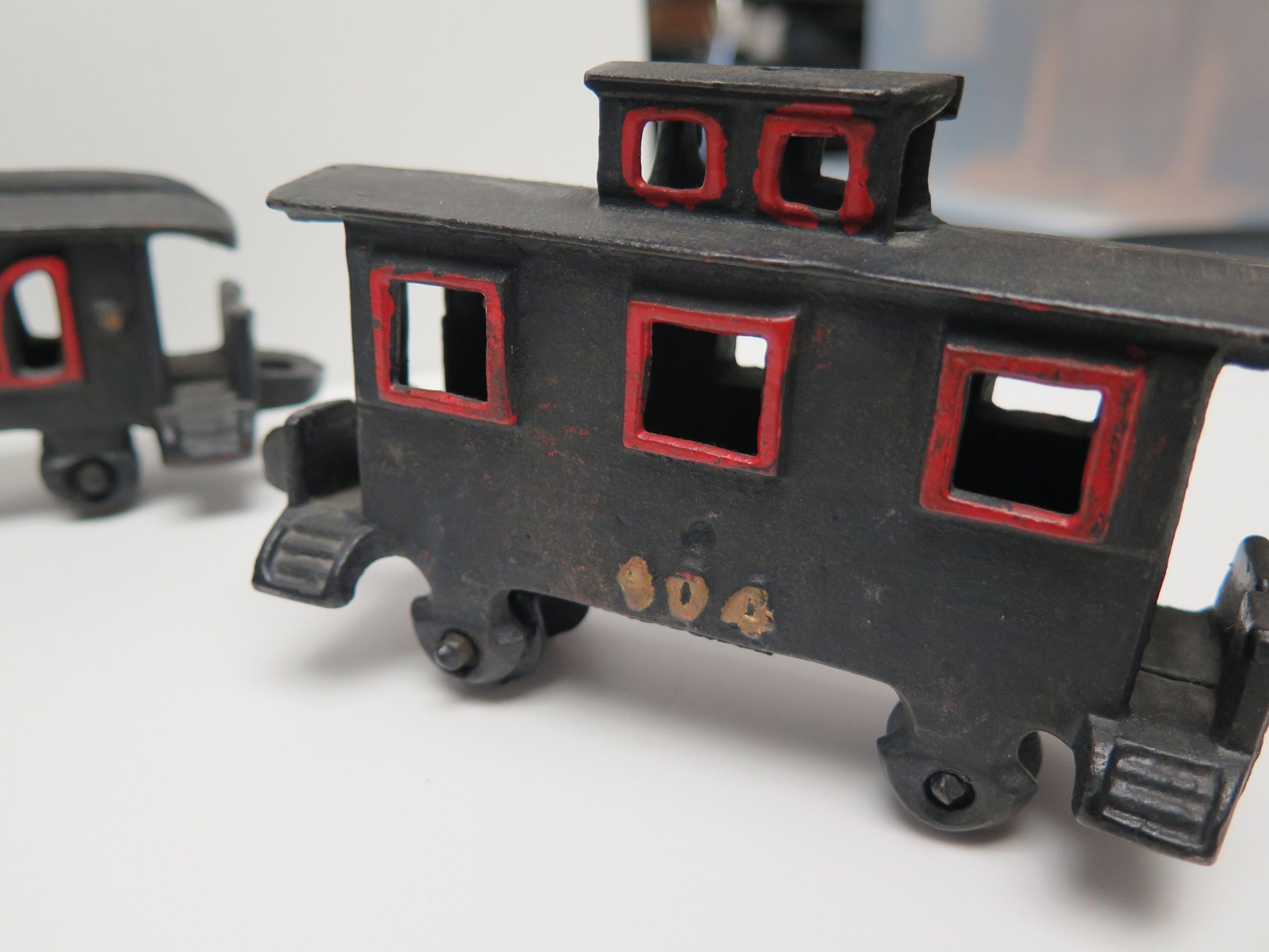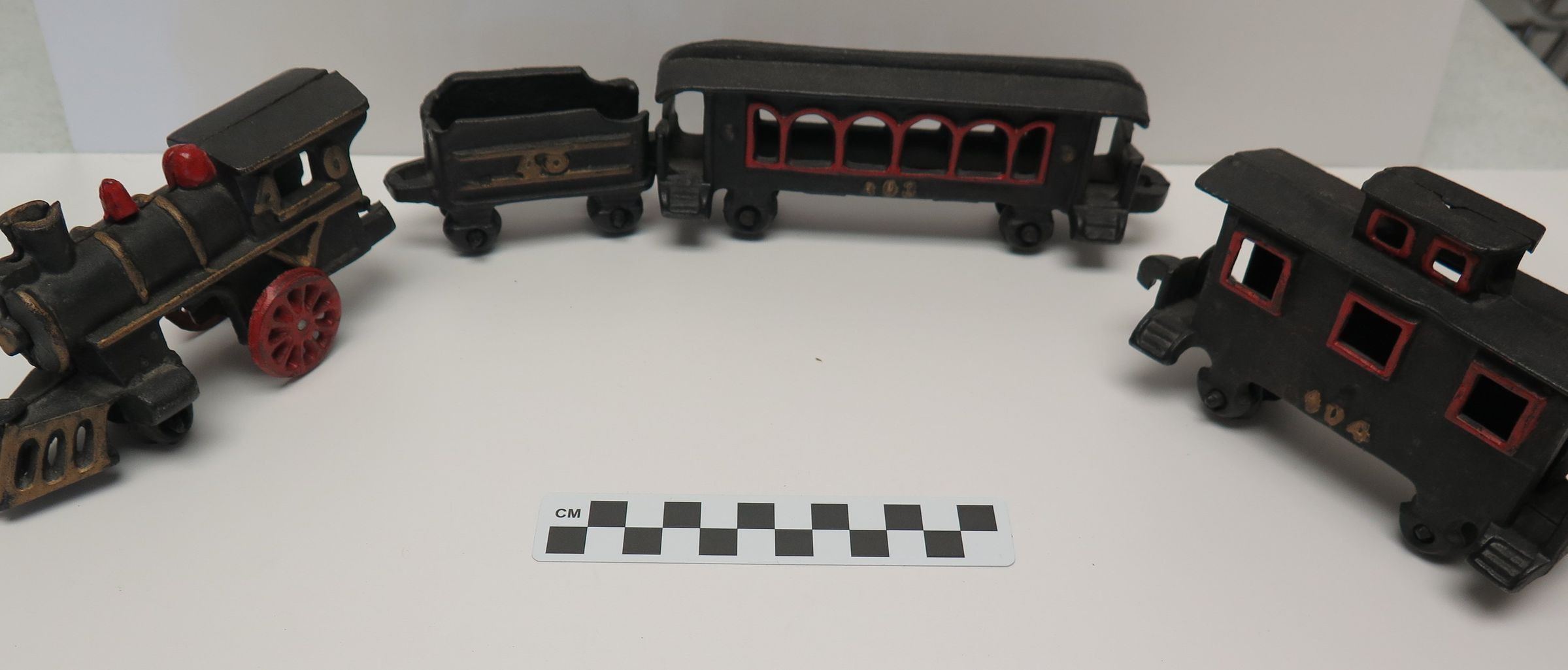 This is a decorative cast iron train set. It consists of four stylized pieces of railroad rolling stock: locomotive, tender, passenger car, caboose. These are painted black with red accents. 3"(H) x 2"(W) x 21.5"(L)