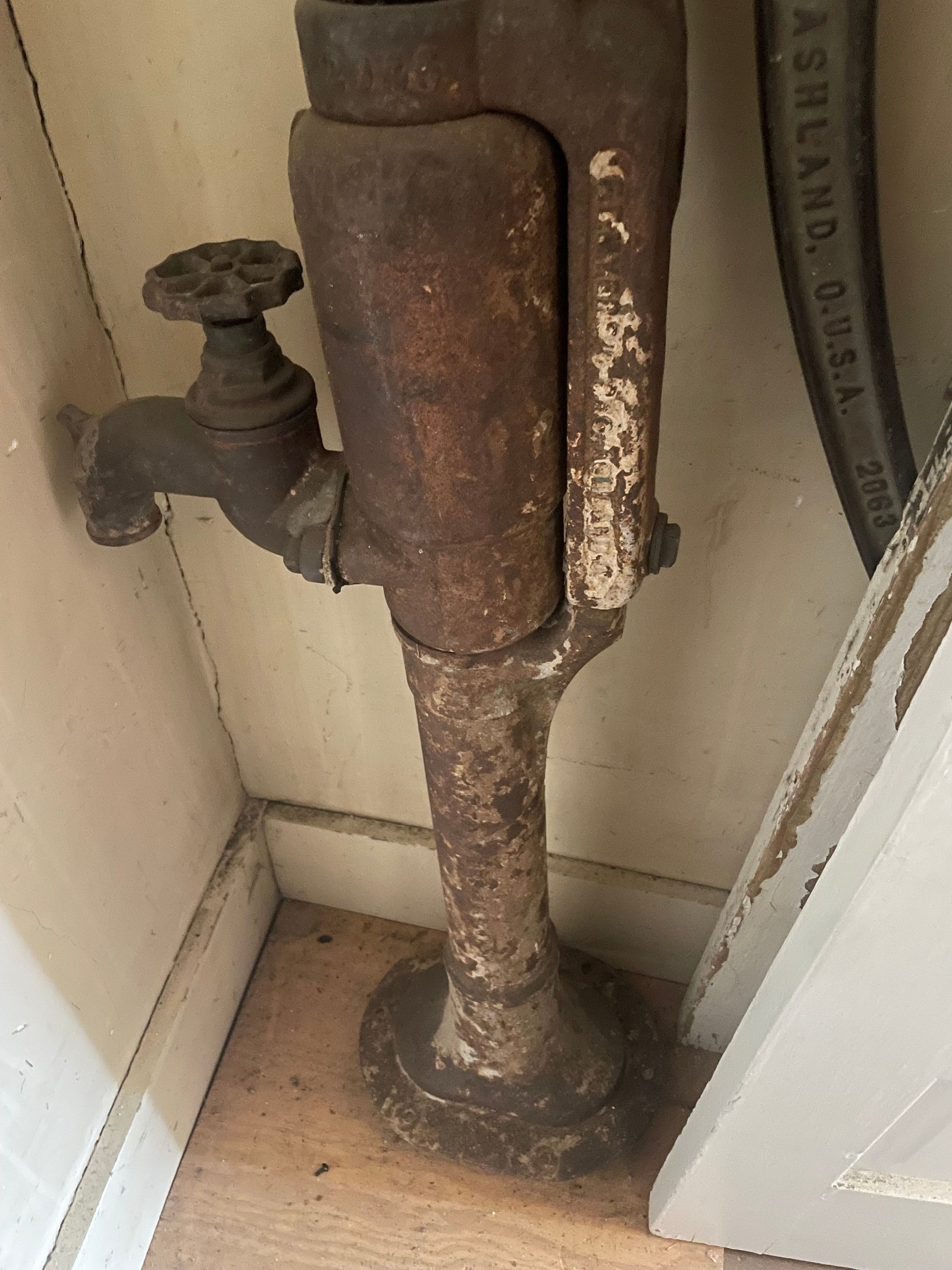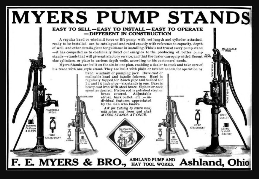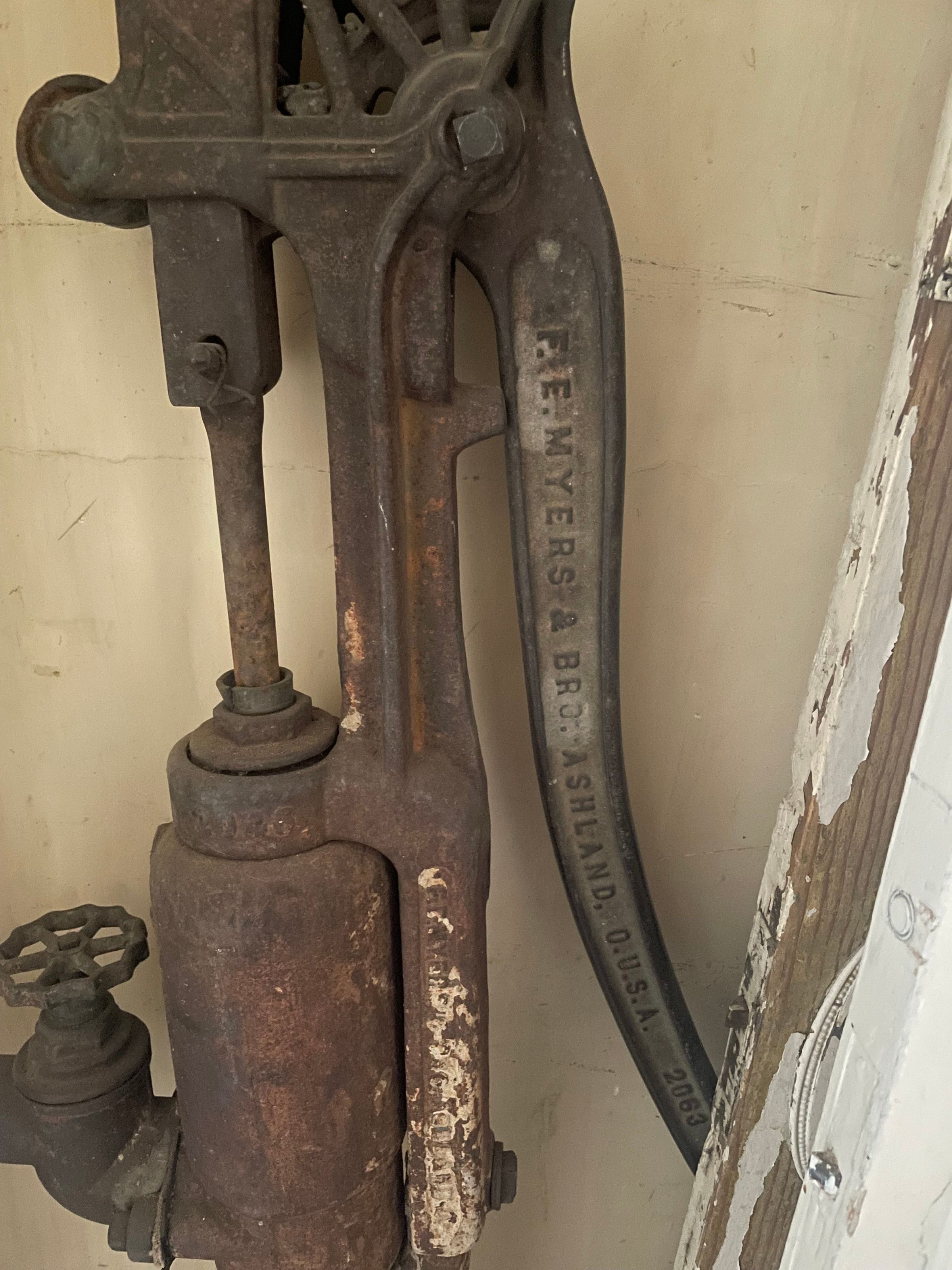 F. E. Myers & Bros. water pump, possibly a "windmill" water pump for use with a windmill to pump water from a well. Handle reads "F.E. Myers & Bros, Ashland, O.U.S.A 2063" Heavily rusted with remnants of white paint. About 6 ft tall (estimate).