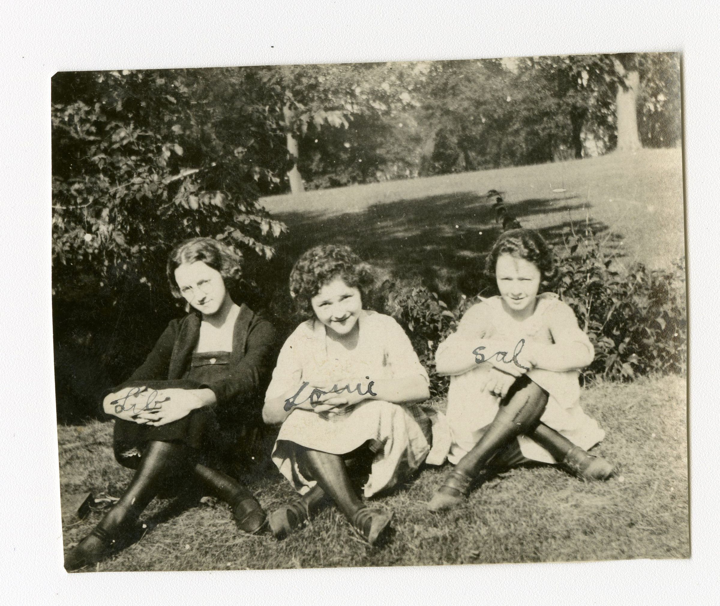 A black and white photograph of three girls. From left to right, they are Lib, Louise?, and Sal Shaw. They are sitting outside. Lib wears a black dress while the other two girls wear white.