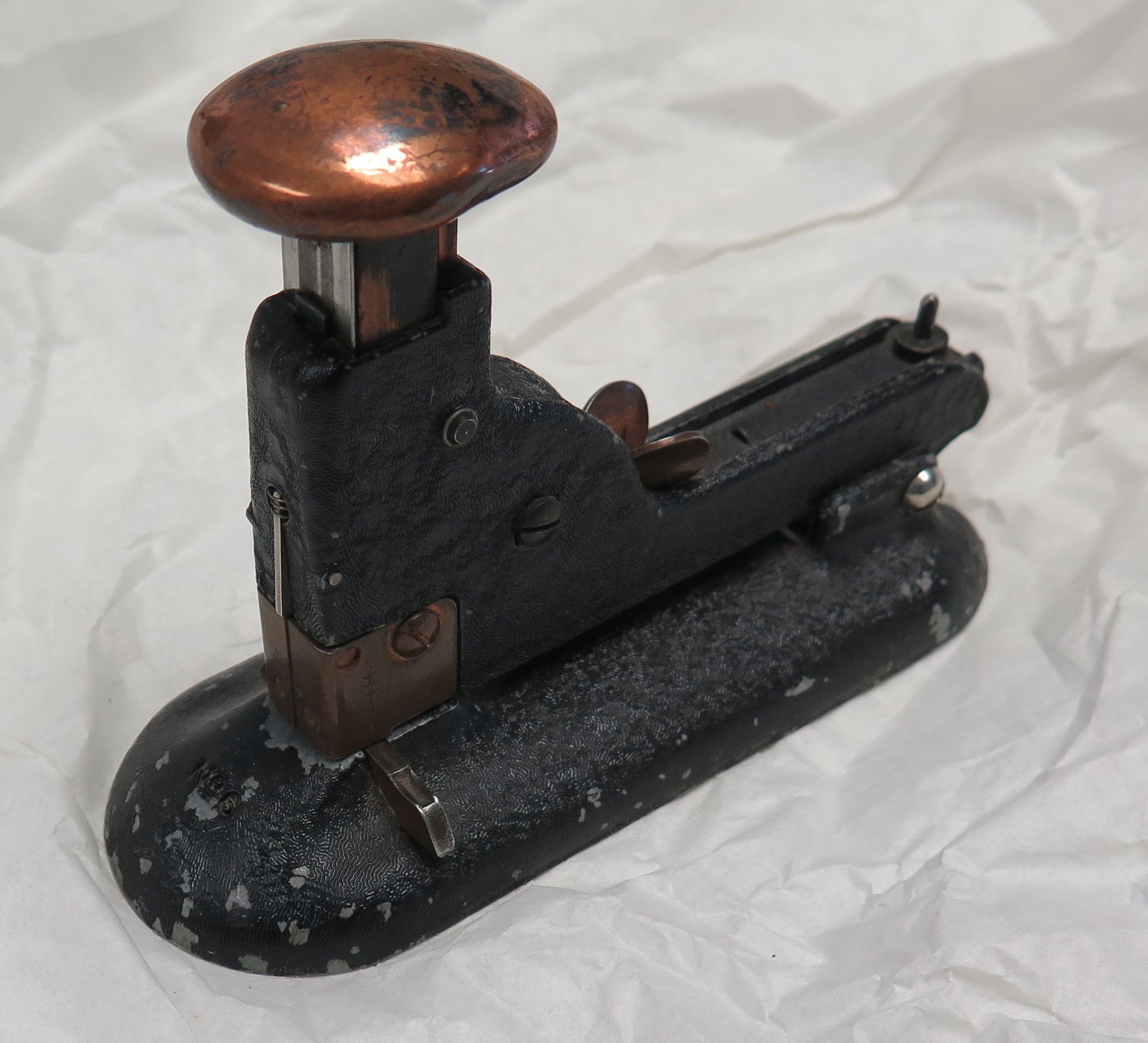 This is a metal stapler that has been partially painted black. The stapler has a knob on the top that is a shiny gold color. The stapler is the Hotchkiss No. 6 model. The stapler measures 4" (h) x 2" (w) x 5.5" (l).