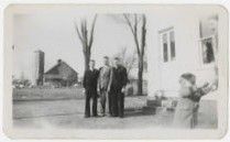 Black and white photograph of three men, a boy, and a woman standing near a farmhouse. A barn and silo are seen in the background. The three men are standing near the corner of the house and are in the center of the frame. The boy is near the right edge of the image. A woman is seen near the boy. The people in the photograph are Clyde Brunner, Gib Brunner, Dale Brunner, Lester K Brunner, and Lib Brunner.