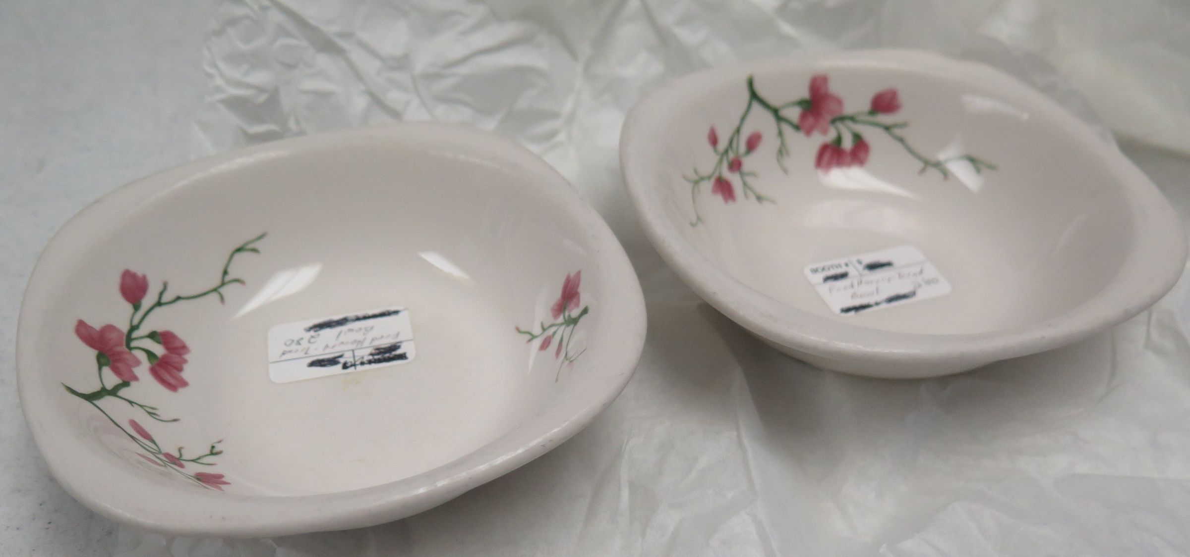 This is a set of two matching white ceramic bowls. The bowls have a pink flower painted on them. There are stickers inside of the bowls indicating what they are, but the picture is too blurry to read. Each bowl measures 1.75" (h) x 5.5" (dia).