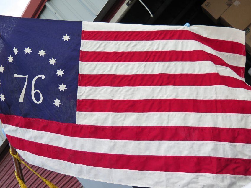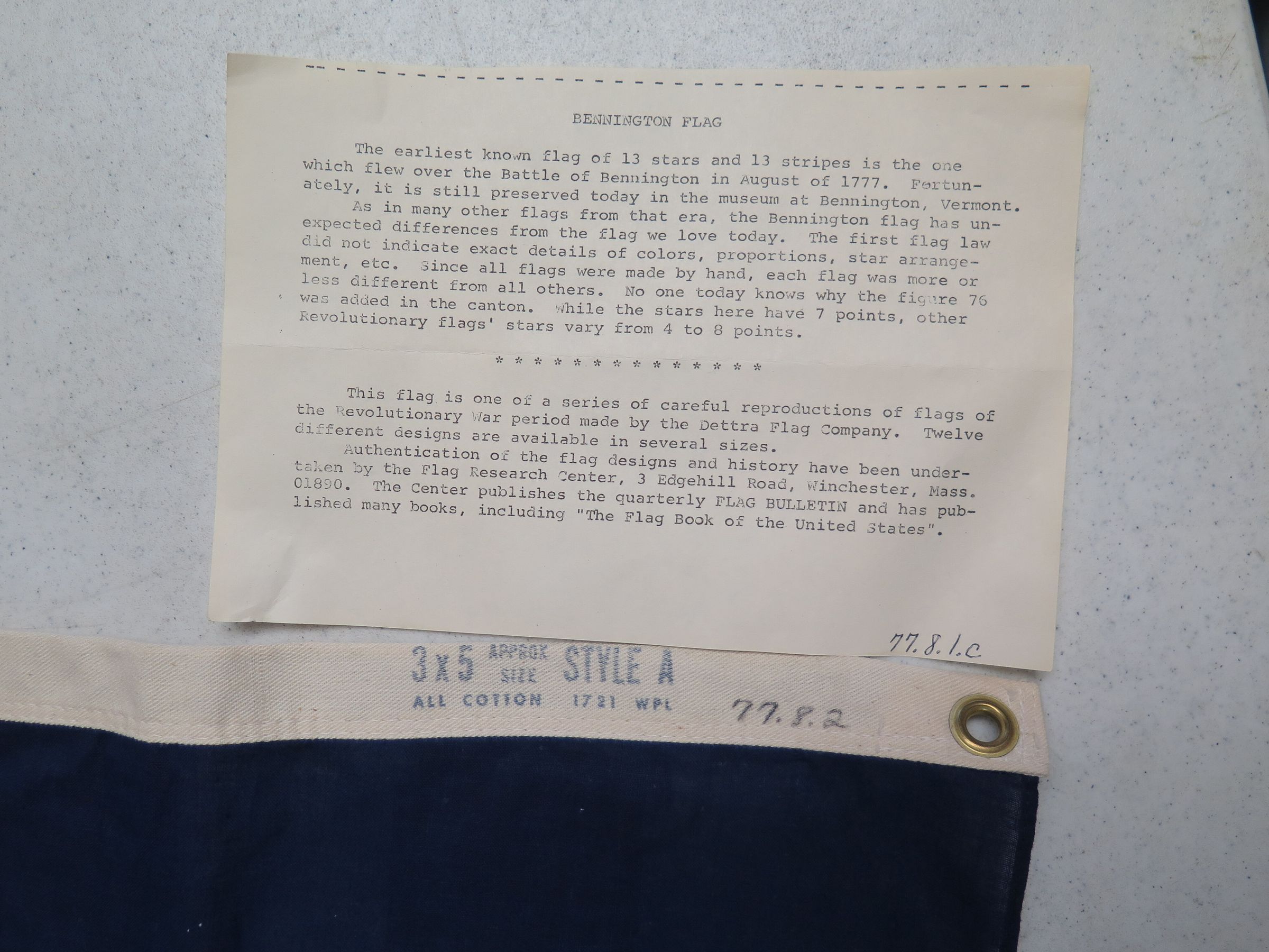 This is a cotton Bennington Flag. The flag is commerative of 1976, with the numbers "76" and 12 white stars in the blue portion of the flag. The remainder of the flag has 13 white and red stripes. The flag measures 3' (w) x 5' (l).Collection