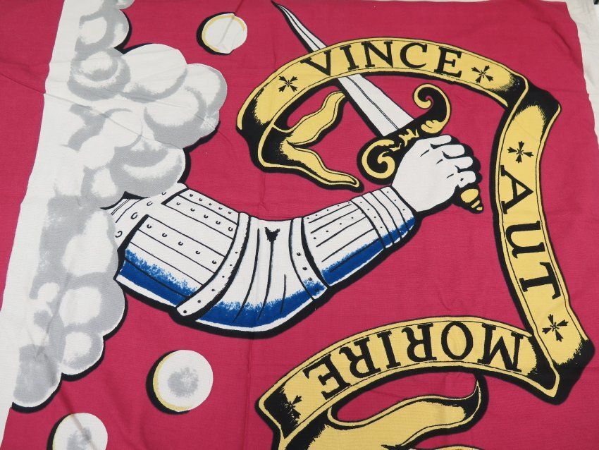 This is a 3' x 5" cotton Bedford Flag. The flag has the image of an arm holding a dagger and the text, "Vince Aut Morire" on the front.