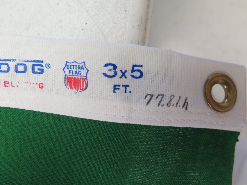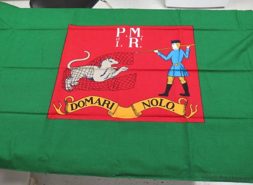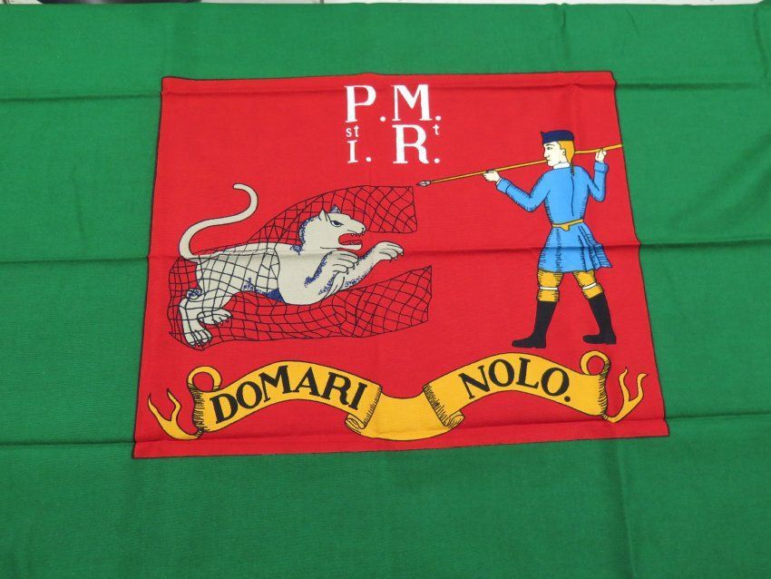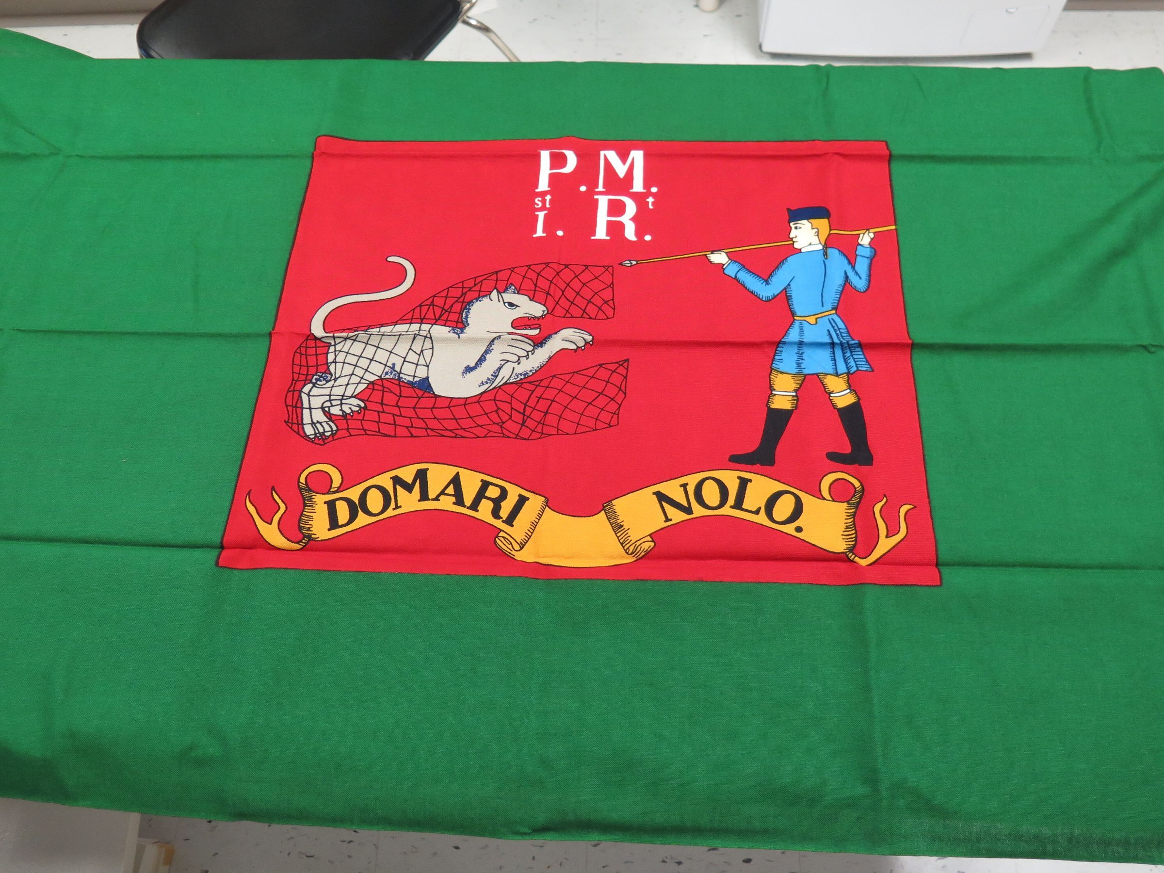 This is a 3' x 5' cotton First Continental Regiment Flag. The flag is green with a red square in the center. On the red square is the image of a man and an animal in a net. Beneath this is the text, "Domari Nolo".Collection