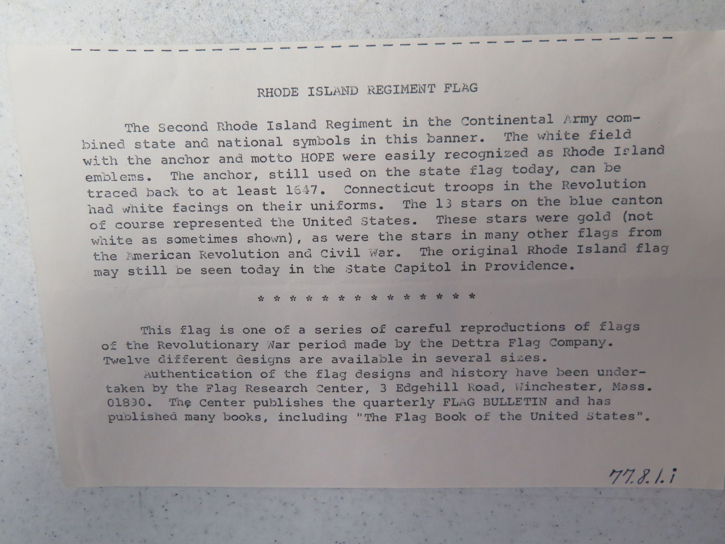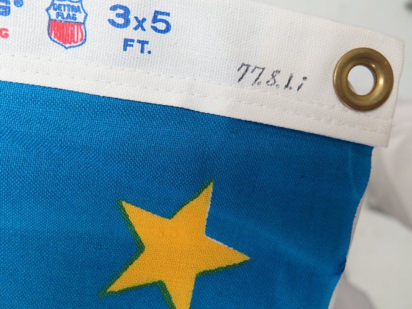 This is a 3' x 5' cotton Rhode Island Regiment Flag. The flag has a white background, a blue square in the top left corner with yellow stars in it, and an anchor in the middle right.Collection