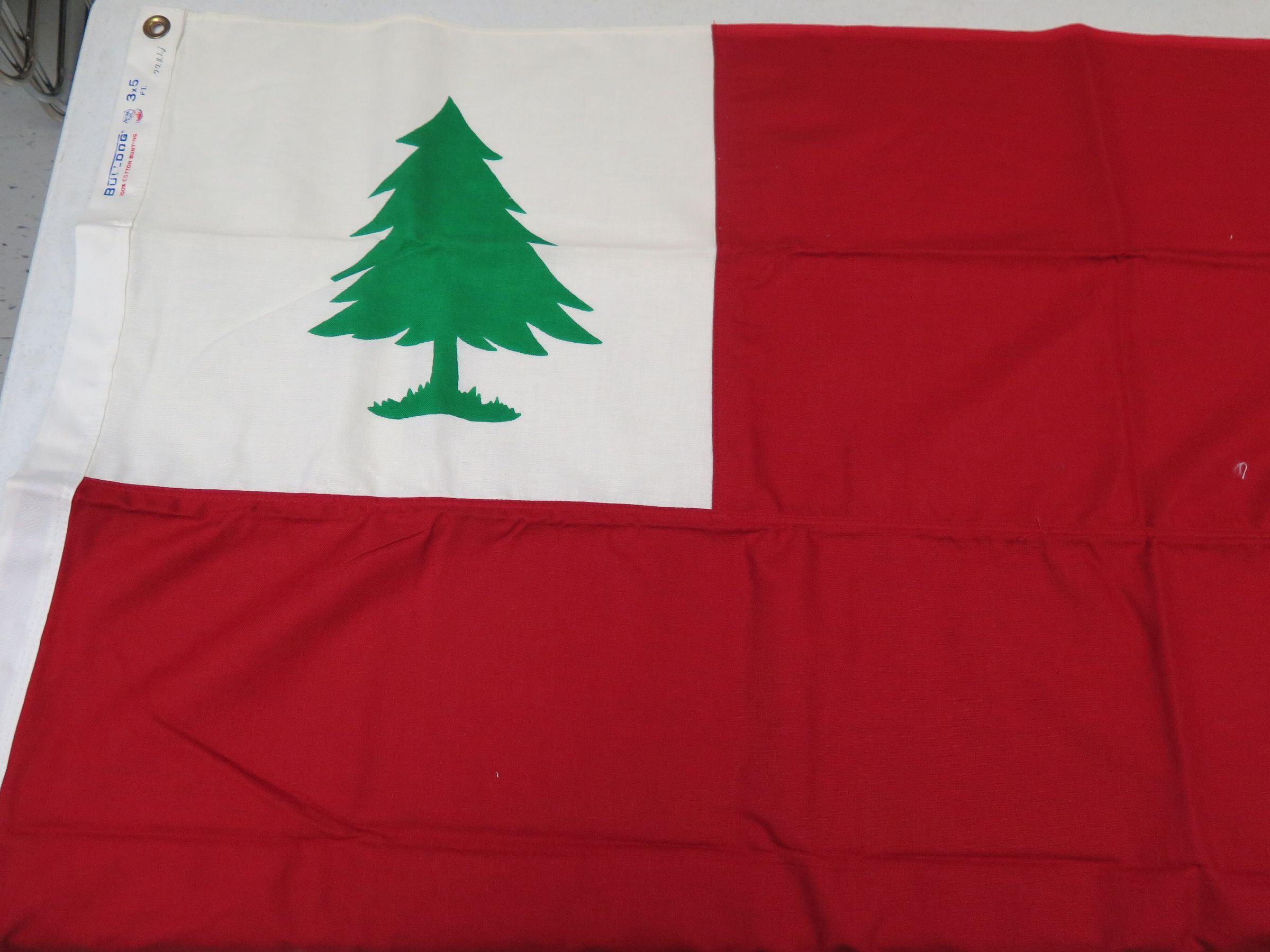 This is a 3' x 5' cotton Bunker Hill Flag. The flag has a red background. In the upper left corner is a white square with a green tree on it.