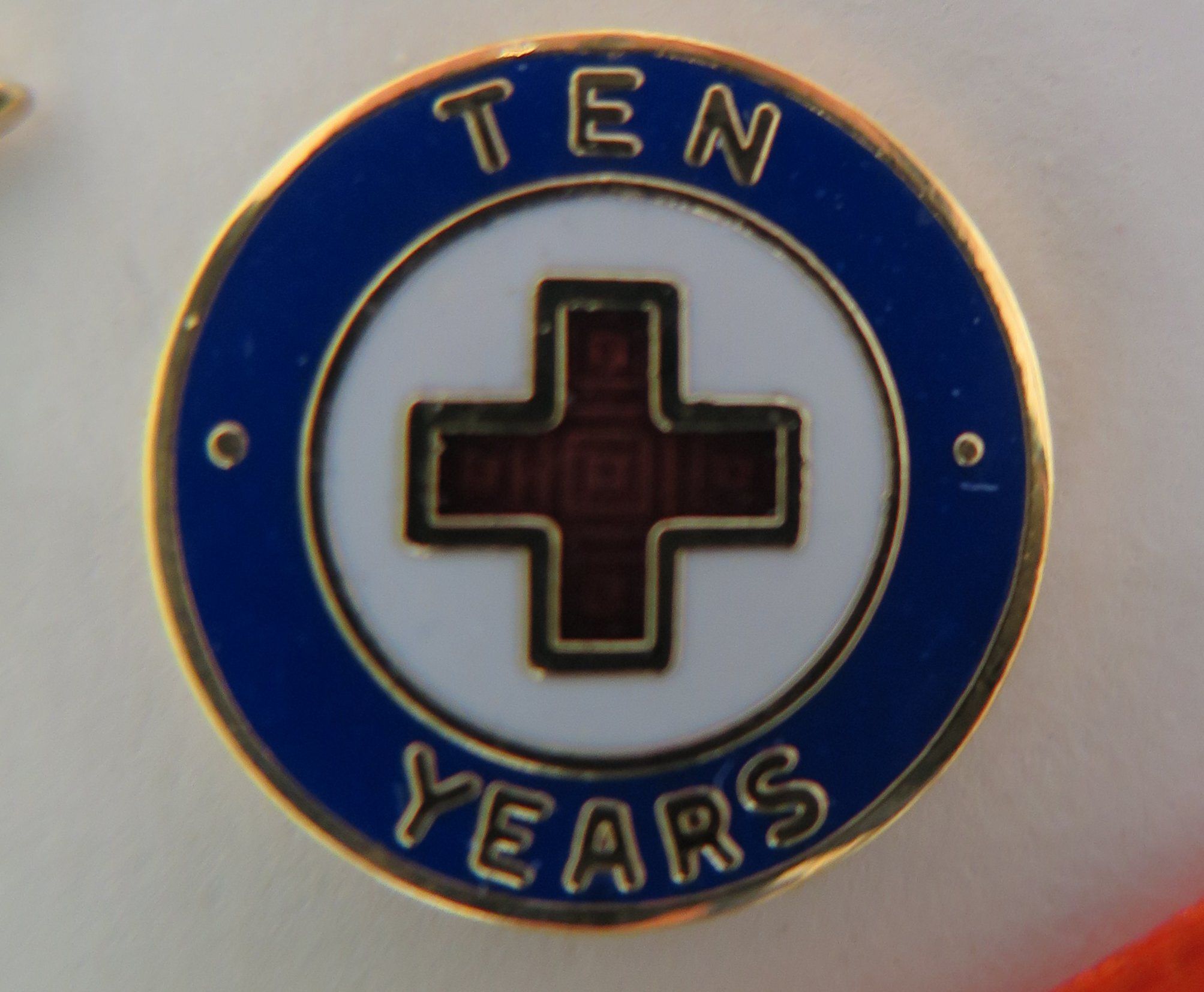 This is a metal lapel pin owned by Jim Shafer. It measures .5"(Dia) x .375"(D). This pin is circular. It features a red cross within a white circular field which is within a blue band which has a gold border. The words "TEN YEARS" are within the blue field.