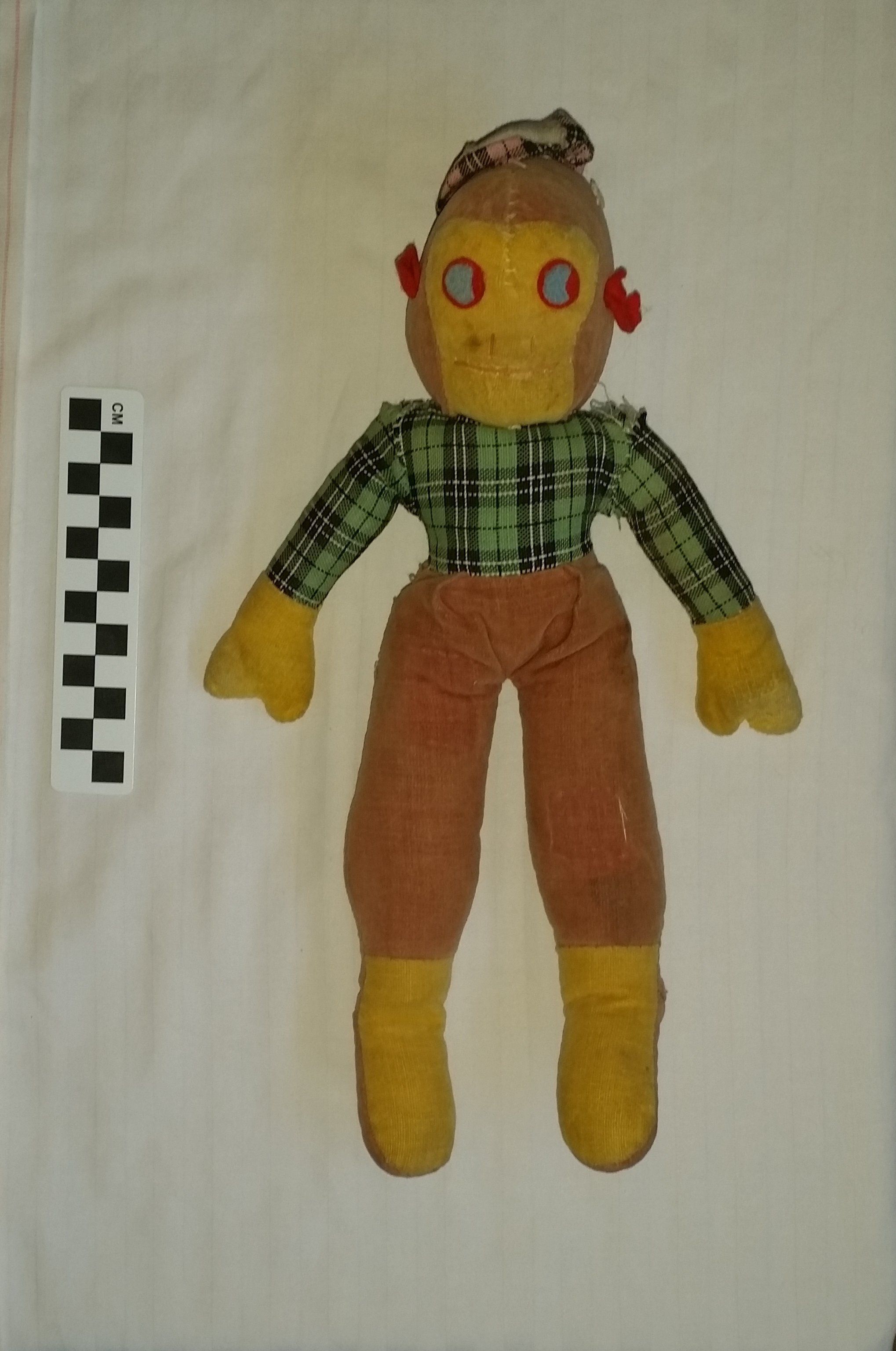 Stuffed toy monkey with green plaid shirt, pants, and a plaid hat. Dimensions are 12"(h) x 7"(w) x 3"(d).Collection