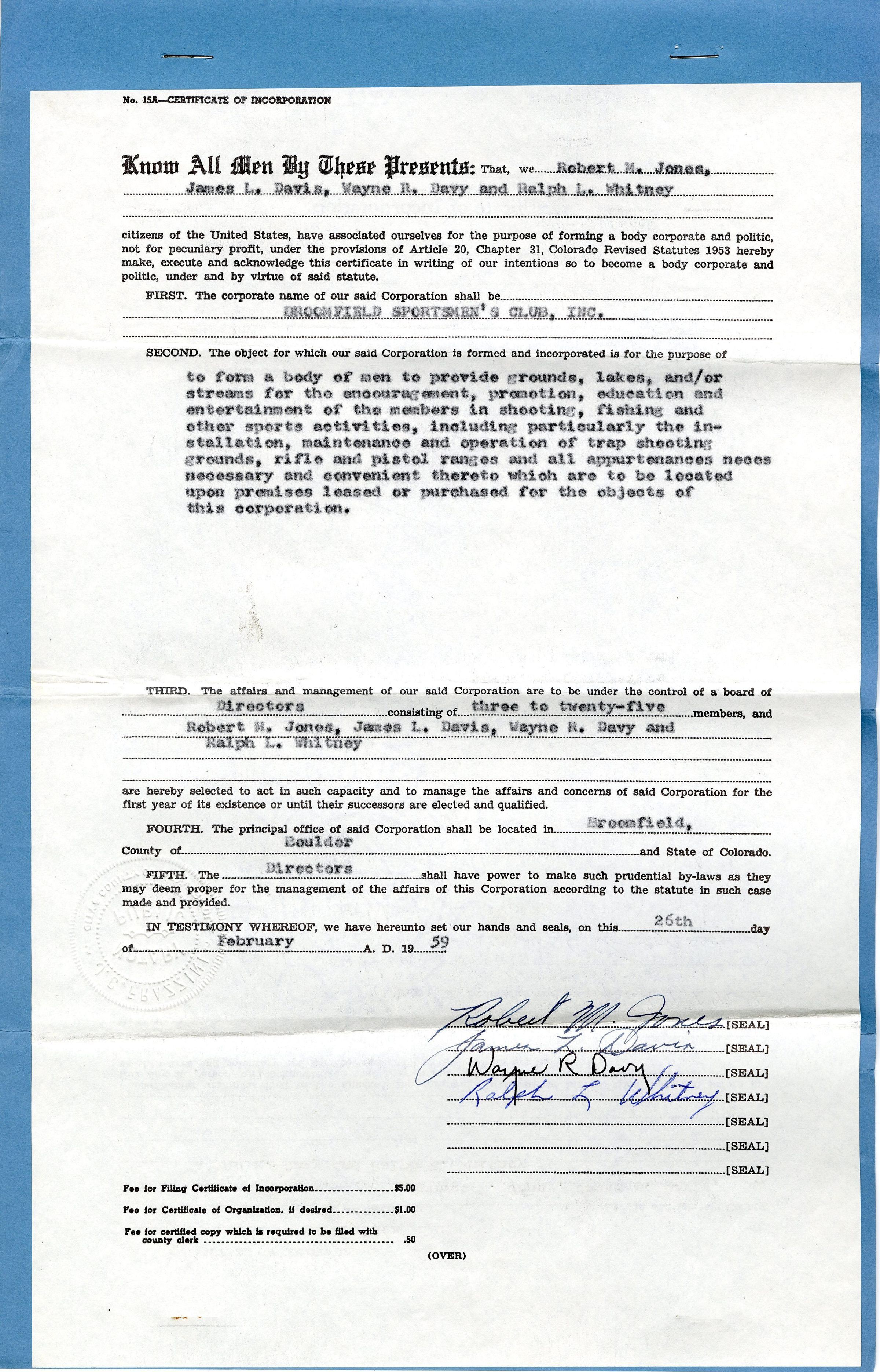 This is a two paged legal sized document (2013.2.1a) incorporating the Broomfield Sportsmen's Club. The signing members were Robert M. Jones, James L. Davis, Wayne R. Davy and Ralph L. Whitney. The documents are stapled to a blue paper backdrop. The documents include an original envelope (2013.2.1b), dated April 26, 1959, with inscription, "Broomfield Sportsmen's Club Certificate of Incorporation" in pen.Collection