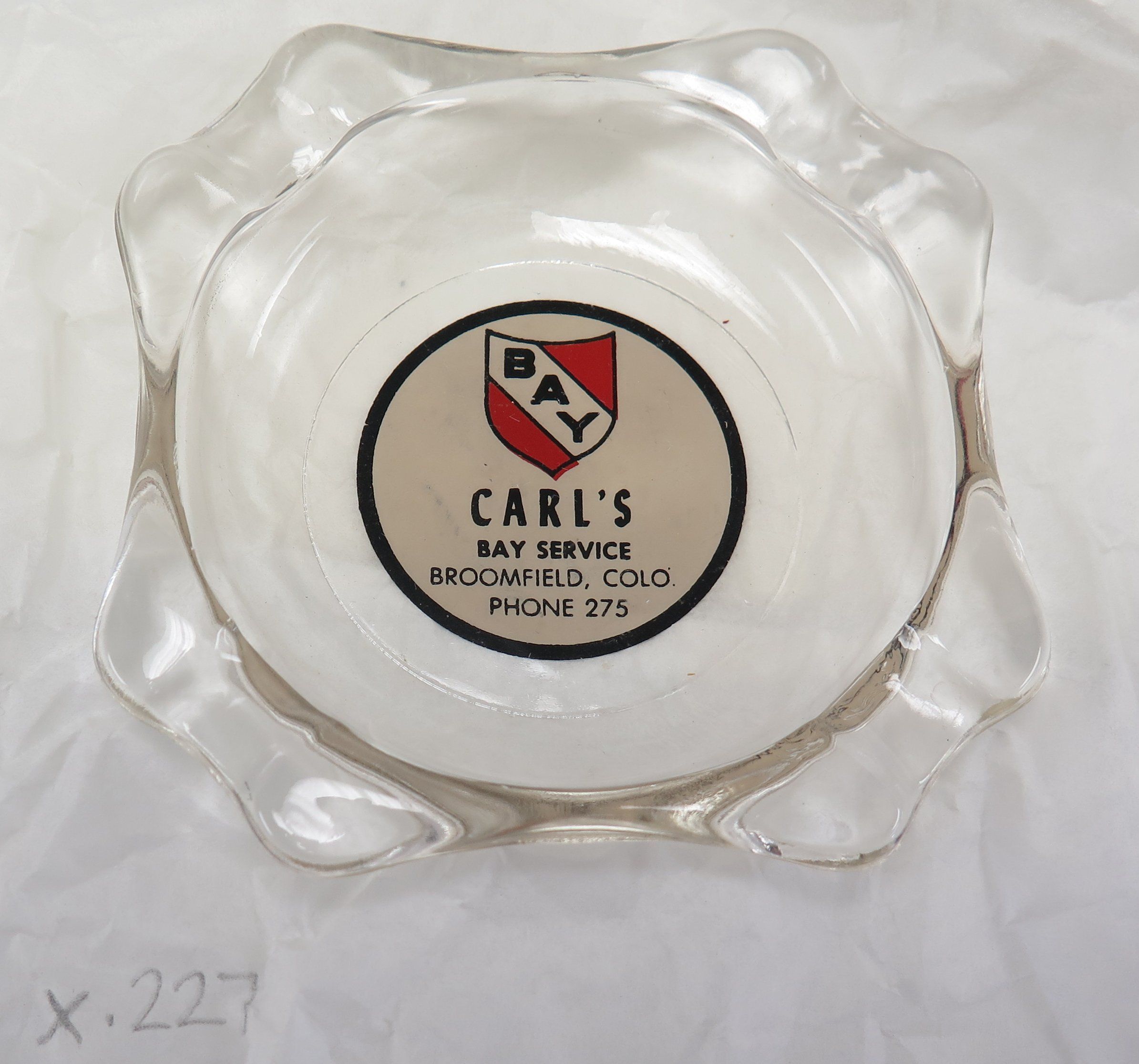 This is a clear glass ashtray with a round logo in the bottom. The text under the BAY logo reads, "Carl's/ Bay Service/ Broomfield, Colo./ Phone 275". The ashtray is a square shape with rounded, almost scalloped corners. The ashtray measures 1.75" (h) x 3.75" (dia).Collection