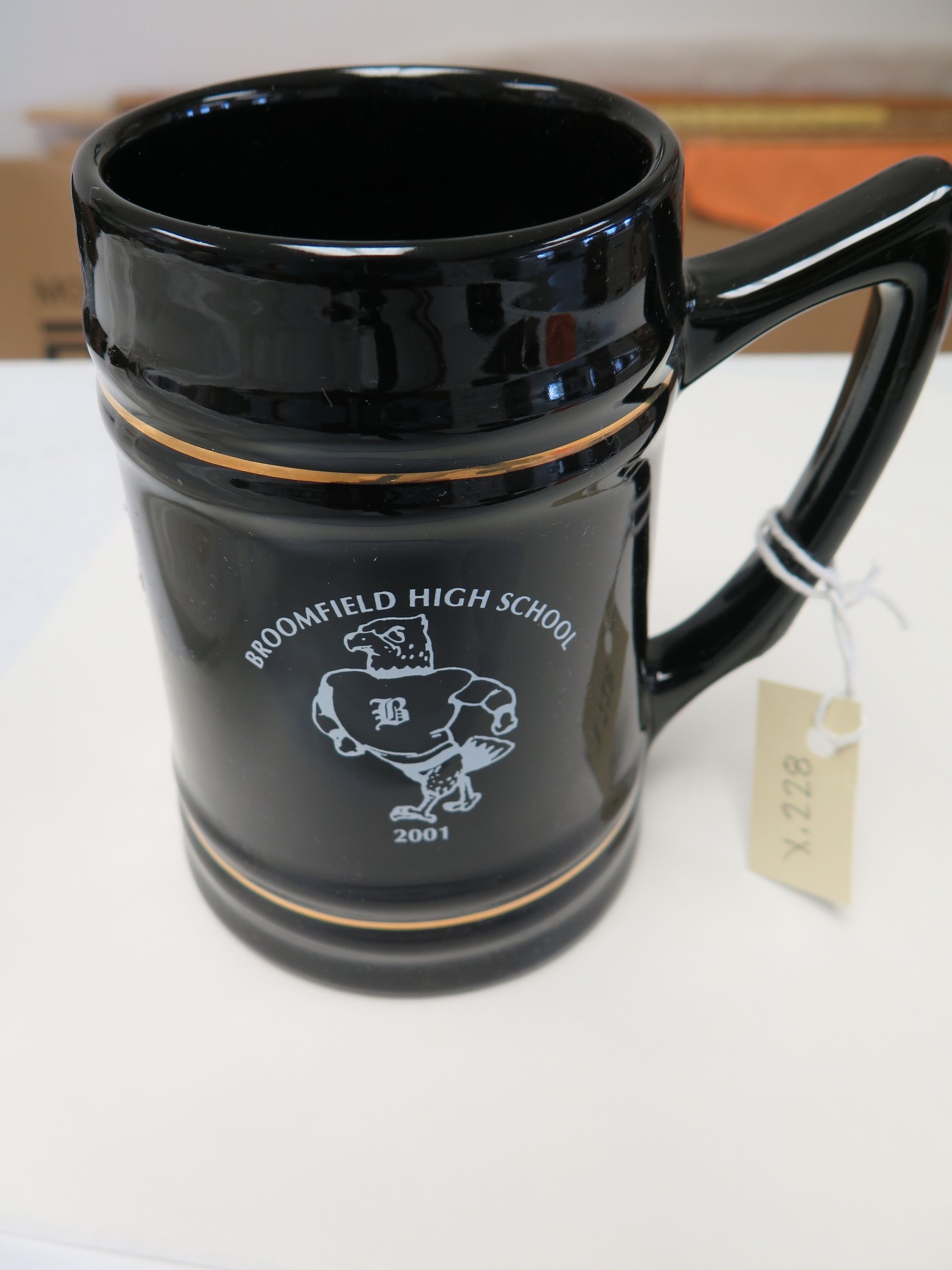 This is a black mug with a handle. The mug has the Broomfield High School mascot on the side in white. Text above the mascot reads, "Broomfield High School", and text below the mascot reads, "2001". The mug measures 5.5" (h) x 5" (w) x 3" (d).
