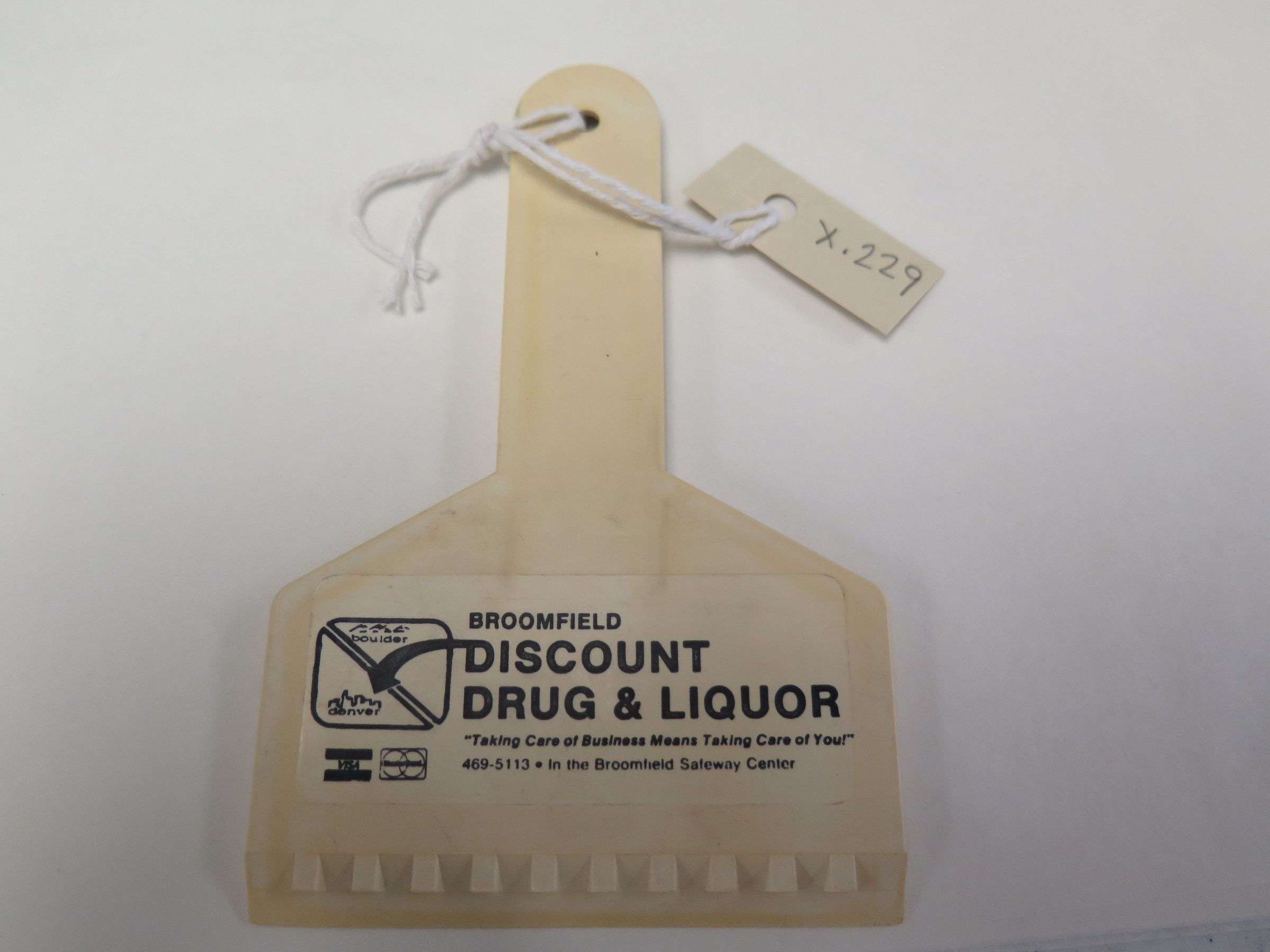 This is a white plastic ice scraper. The scraper has the following text on the side: "Broomfield/ Discount/ Drug & Liquor/ 'Taking Care of Business Means Taking Care of You!'/ 469-5113 In the Broomfield Safeway Center". The scraper measures 3.5" (w) x 5.5" (l).