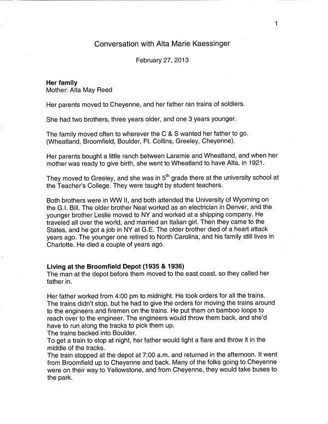 Summary and notes of an oral history interview conducted by Mary Ann McNair with Alta Marie Kaessinger on February 27, 2013. Kaessinger was the daughter of Broomfield depot station agent Robert M Reed. She and her family lived in the depot from 1935 to 1936. The summary gives brief details on Kaessinger's family history, what life was like living and working in the depot, and her family's life after moving out of the depot in 1937.Collection